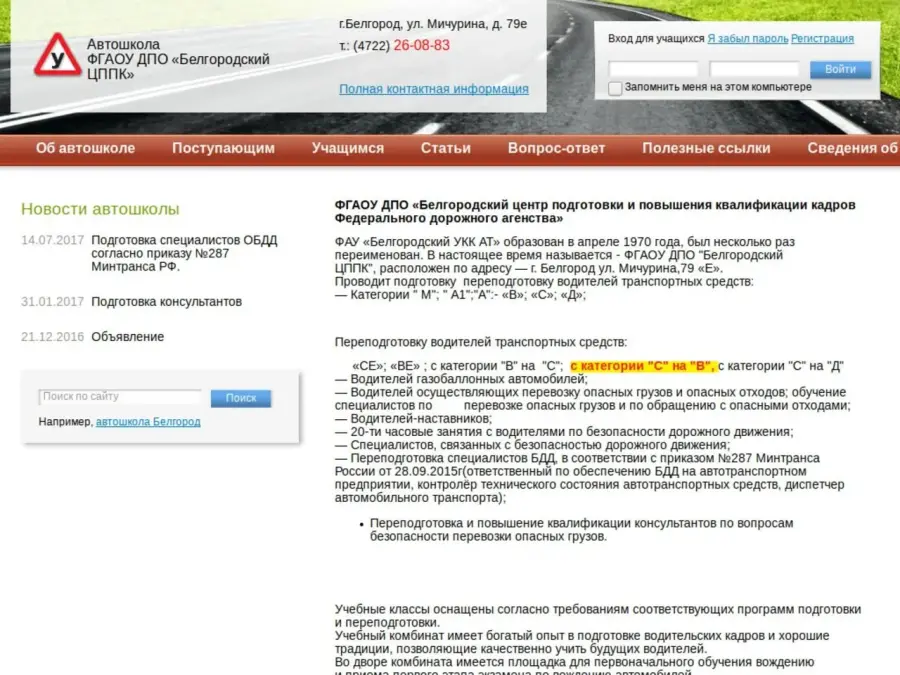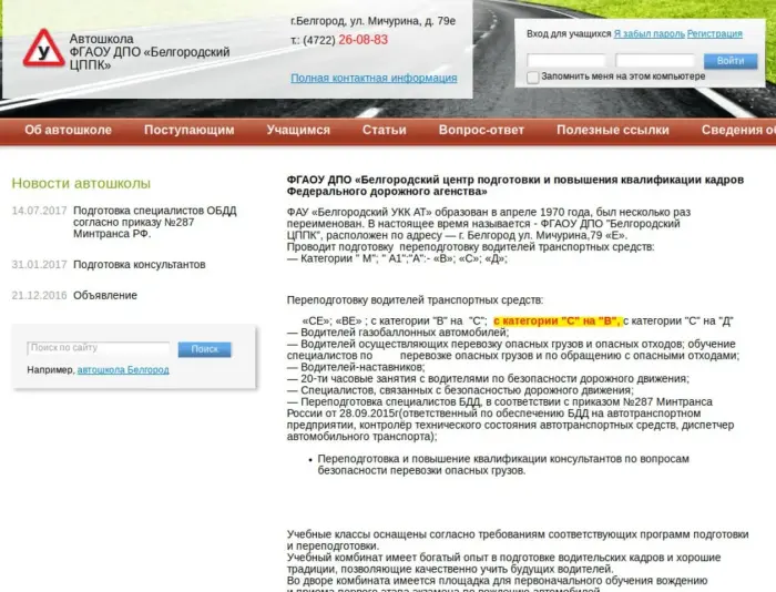 "Учебные классы оснащены согласно требованиям соответствующих программ подготовки и переподготовки. Учебный комбинат имеет богатый опыт в подготовке водительских кадров и хорошие традиции, позволяющие качественно учить будущих водителей. По адресу г. Белгород, ул. Мичурина 79е, во дворе комбината имеется площадка, оснащенная 2 эстакадами для выполнения упражнений трогания на "подъем" и упражнениями: "парковка", "змейка", "бокс" (гараж), "разворот"."