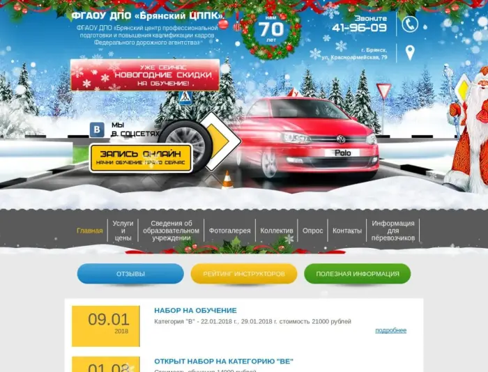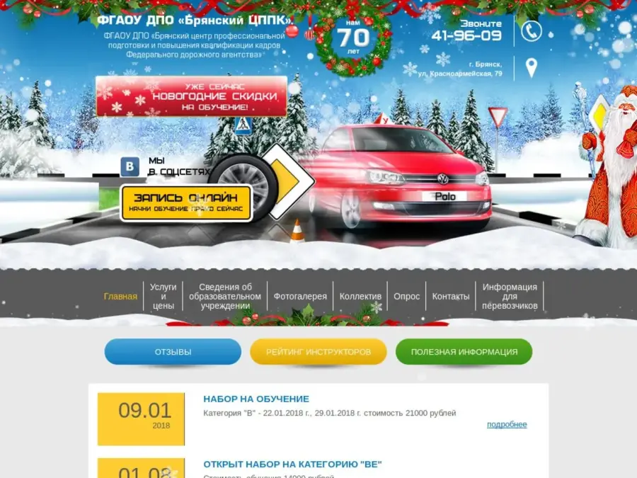 ФАУ «Брянский центр профессиональной подготовки и повышения квалификации кадров федерального дорожного агентства». За годы своего существования наша организация накопила огромный опыт подготовки водительских кадров категории «В», «С», «Д», «Е». Мы ведем обучение водителей, осуществляющих перевозку опасных грузов, работающих на газобаллонных автомобилях, специалистов по безопасности дорожного движения, квалификационную подготовку Российских перевозчиков. Автошкола имеет свой автодром, хорошо оборудованные учебные кабинеты, большой парк учебных автомобилей, состоящий из новых моделей отечественных и зарубежных производителей. У нас можно пройти ускоренный курс обучения вождению для лиц, имеющих навыки вождения автомобиля, или восстановить утраченные навыки, гибкий график обучения, сдача экзаменов в ГИБДД по месту обучения.