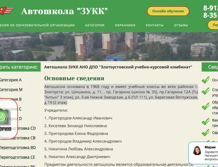 Автошкола основана в 1968 году и имеет учебные классы во всех районах г. Златоуста: ул. Шишкина, д. 11, , пр. Гагарина (школа № 35), пр.Гагарина 12А (ТЦ "Алтын" 3 этаж), ул. 3-ая Нижне Заводская, д 6 (ПЛ 111), ул. Береговая Ветлужская, д 19 (2 этаж)