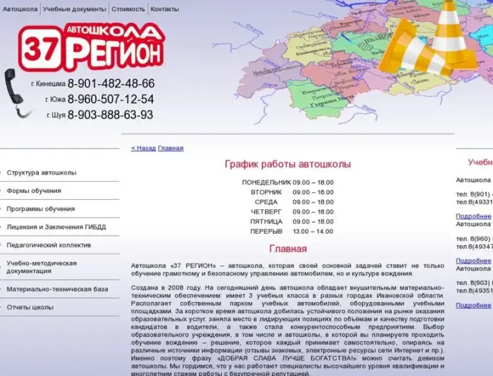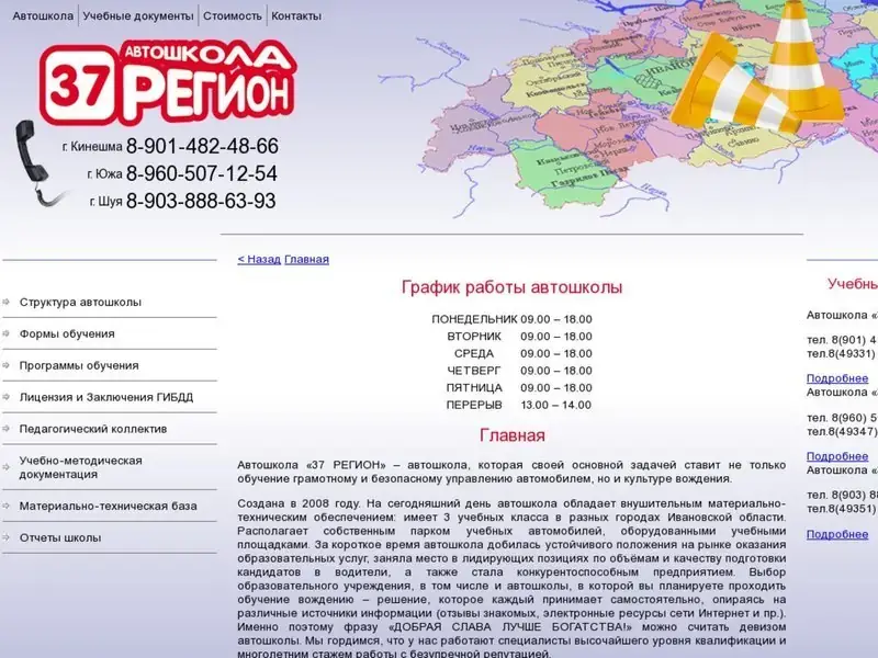 "На сегодняшний день автошкола обладает внушительным материально-техническим обеспечением: имеет 3 учебных класса в разных городах Ивановской области. Располагает собственным парком учебных автомобилей, оборудованными учебными площадками. За короткое время автошкола добилась устойчивого положения на рынке оказания образовательных услуг, заняла место в лидирующих позициях по объёмам и качеству подготовки кандидатов в водители, а также стала конкурентоспособным предприятием. Выбор образовательного учреждения, в том числе и автошколы, в которой вы планируете проходить обучение вождению – решение, которое каждый принимает самостоятельно, опираясь на различные источники информации (отзывы знакомых, электронные ресурсы сети Интернет и пр.). Именно поэтому фразу «ДОБРАЯ СЛАВА ЛУЧШЕ БОГАТСТВА!» можно считать девизом автошколы. Мы гордимся, что у нас работают специалисты высочайшего уровня квалификации и многолетним стажем работы с безупречной репутацией. Автошкола «37 РЕГИОН» - делает Ваше обучение увлекательным и доступным, а вождение легким и безопасным!"