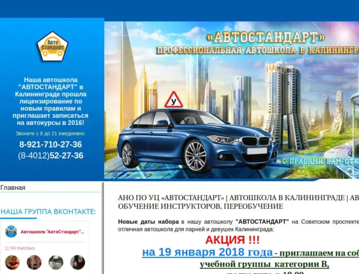 "Автошкола «АВТОСТАНДАРТ» предоставляет возможность пройти курс обучения водителей категории "В", переподготовку с "С" на "В", подготовку преподавателей и мастеров производственного обучения. В ближайшее время планируется открытие наших учебных центров в других районах города, и получение лицензии на обучение других категорий. Автокурсы в Калининграде по теории и вождению организованы так, чтобы максимально обеспечить удобство обучения и значительно упростить процесс сдачи экзамена в ГИБДД. Базовый курс обучения в Учебном Центре включает: теоретическую подготовку, вождение, учебную литературу, выдачу свидетельства установленного образца, организованную сдачу экзаменов в ГИБДД. Занятия по теории проводятся по гибкому графику. С инструктором по вождению график занятий составляется индивидуально, исходя из возможностей ученика."