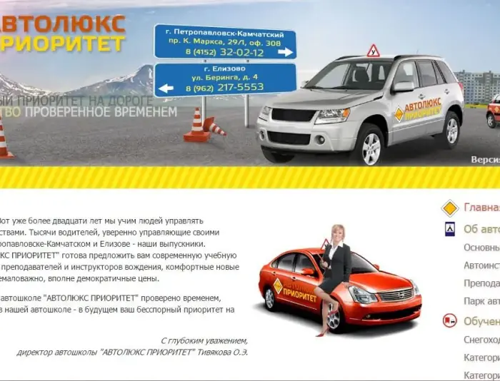Дорогие камчатцы! Вот уже более двадцати лет мы учим людей управлять транспортными средствами. Тысячи водителей, уверенно управляющие своими автомобилями в Петропавловске-Камчатском и Елизове - наши выпускники. Автошкола "АВТОЛЮКС ПРИОРИТЕТ" готова предложить вам современную учебную базу, высококласных преподавателей и инструкторов вождения, комфортные новые автомобили и, что немаловажно, вполне демократичные цены. Качество обучения в автошколе "АВТОЛЮКС ПРИОРИТЕТ" проверено временем, навыки полученные в нашей автошколе - в будущем ваш бесспорный приоритет на дороге!