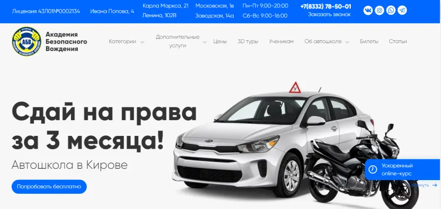 "В настоящее время Академия Безопасного Вождения - это автошкола Кирова, в которой применяются абсолютно новые подходы к обучению водителей, дающие гораздо более высокие результаты, по сравнению с традиционными. Наша основная цель – это повышение уровня безопасности на дорогах за счет качественной подготовки водителей. Стремясь к этому, мы занимаемся обучением водителей, формируя тем самым безопасность нашего города."