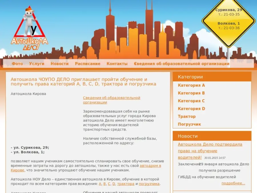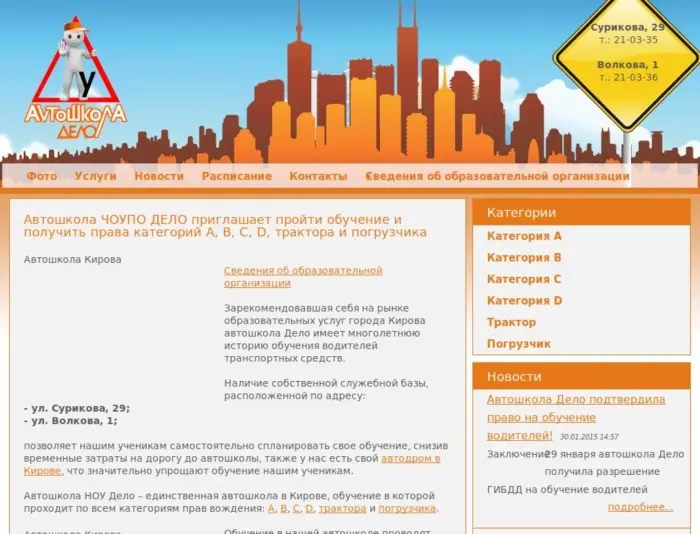 Автошкола НОУ УПЦ "ДЕЛО" на рынке образовательных услуг с 1998 года. Первоначальное обучение происходило только по категории В. С 2001 года, обучение проводится уже по категориям В, C, D. С 2010 года наша автошкола занимается подготовкой водителей на категории А и Е. В 2012 мы открыли обучение на водителей погрузчиков и трактористов всех категорий.