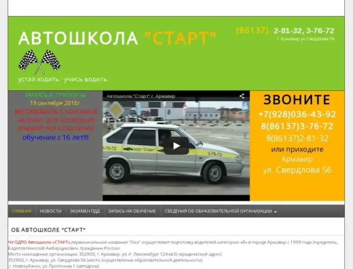 Учебные аудитории автошколы «СТАРТ» оборудованы современными компьютерами, наглядными учебными пособиями и тренажерами. Учебная площадка для практического вождения расположена в черте города, хорошо освещена, оборудована эстакадой, светофорами и дорожной разметкой. Учащиеся доставляются на площадку на учебных автомобилях. К процессу обучения привлечены опытные преподаватели и инструкторы с солидным стажем преподавания, качество работы которых подтверждается отзывами учеников. Более 70 % учащихся приходят в нашу автошколу по рекомендации родственников, друзей и знакомых. Курсы теории и вождения организованы так, чтобы максимально обеспечить удобство обучения и значительно упростить процесс сдачи экзамена в ГИБДД. Курс теории также включает в себя лекции по медицине и психологический тренинг