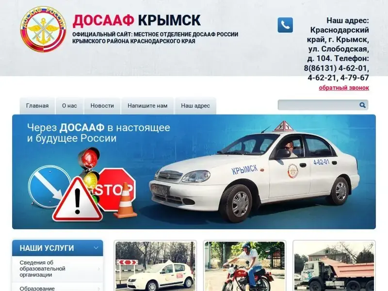 Местное отделение ДОСААФ Крымского района. Сегодня автомобиль прочно вошел в нашу жизнь. Для одних это средство передвижения в первую очередь, для других комфорт, мобильность, престиж, роскошь. Однако, несмотря на то, какие причины Вас побудили обзавестись автомобилем, в первую очередь нужно пройти курс обучения вождению автомобилем, если на момент приобретения автотранспортного средства вы еще не имеете водительского удостоверения.
