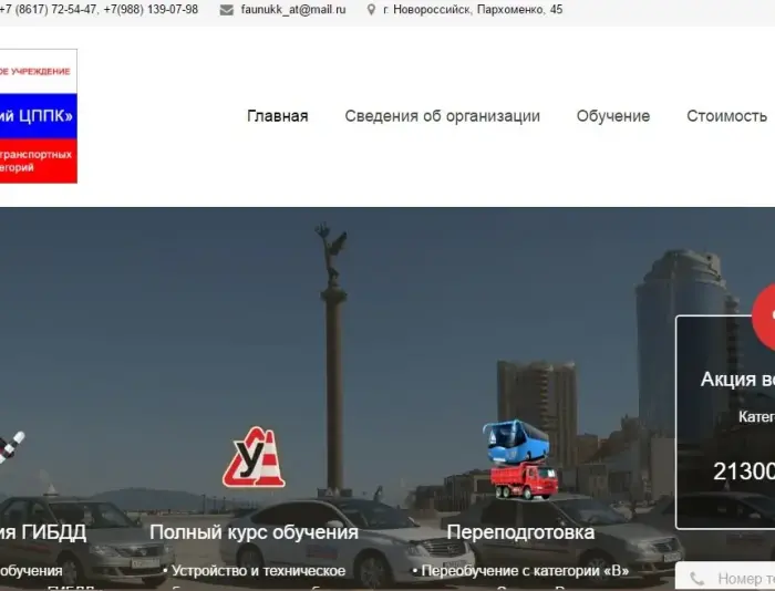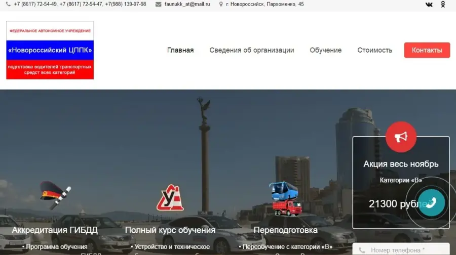 ФЕДЕРАЛЬНОЕ ГОСУДАРСТВЕННОЕ АВТОНОМНОЕ ОБРАЗОВАТЕЛЬНОЕ УЧРЕЖДЕНИЕ ДОПОЛНИТЕЛЬНОГО ПРОФЕССИОНАЛЬНОГО ОБРАЗОВАНИЯ «НОВОРОССИЙСКИЙ ЦЕНТР ПРОФЕССИОНАЛЬНОЙ ПОДГОТОВКИ И ПОВЫШЕНИЯ КВАЛИФИКАЦИИ КАДРОВ ФЕДЕРАЛЬНОГО ДОРОЖНОГО АГЕНТСТСВА». Программы подготовки: категории А,В,С, переподготовка на категории А,D,Е,С,В Учебные транспортные средства: обновленный на 80% учебный легковой автомобильный парк в количестве 25 единиц учебной автомобильной техники со сроком эксплуатации не более 3-4 лет. В штате комбината 12 преподавателей по теоретическому курсу и 35 инструкторов производственного обучения вождению, всего в штате 71 сотрудник.