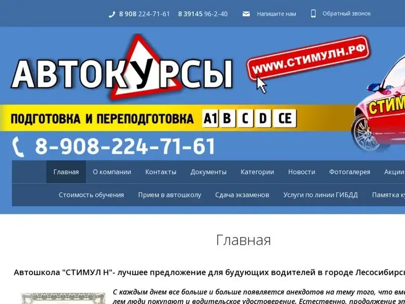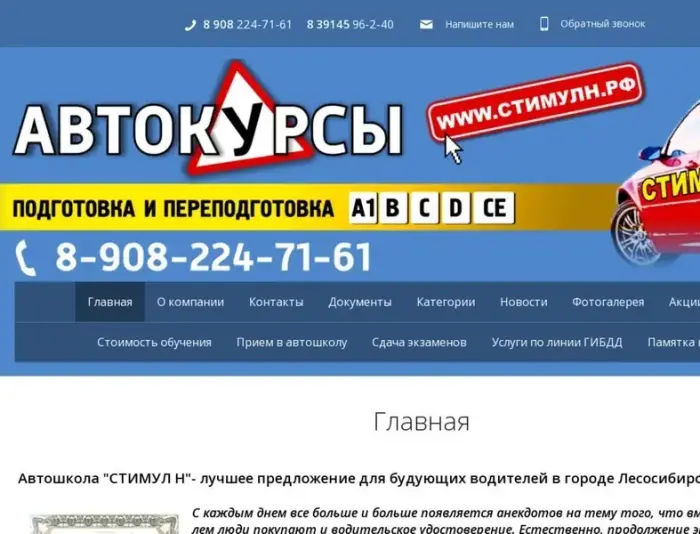 Для тех, кто хотел приобрести навыки вождения, открылись широкие возможности не только качественно обучиться, но и повысить свой профессиональный уровень. В автошколе высококвалифицированный преподавательский состав. Большой опыт работы (10 лет) делает «СТИМУЛ Н» одним из самых лучших в Енисейском районе. За эти годы автошкола выпустила более 6000 человек. У автокурсов высокий рейтинг и положительные отзывы, поэтому лучшая наша реклама-наши выпускники. Те, кто научился ездить, и получил права, рекомендуют нас своим знакомым, друзьям, родственникам. Для обучающихся предоставляется 3 оборудованных учебными пособиями класса для теоретического обучения, оснащенные различными программами, компьютерами, автотренажерами и макетами агрегатов автомобиля. Имеем свой автодром, большой автопарк с машинами отечественного и иностранного производства , как с механической, так и с автоматической коробкой передач. Только в нашей автошколе вы можете открыть все категории.