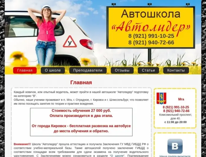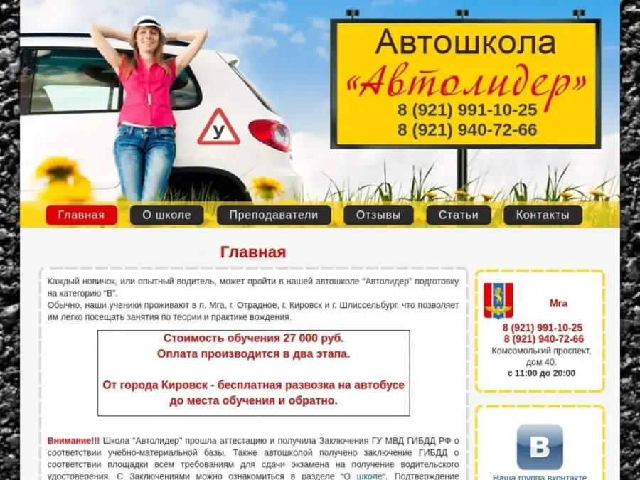 Каждый новичок, или опытный водитель, может пройти в нашей автошколе “Автолидер” подготовку на категорию “B”.nОбычно, наши ученики проживают в п. Мга, Кировске, Отрадном и Шлиссельбурге, что позволяет им легко посещать занятия по теории и практики вождения.