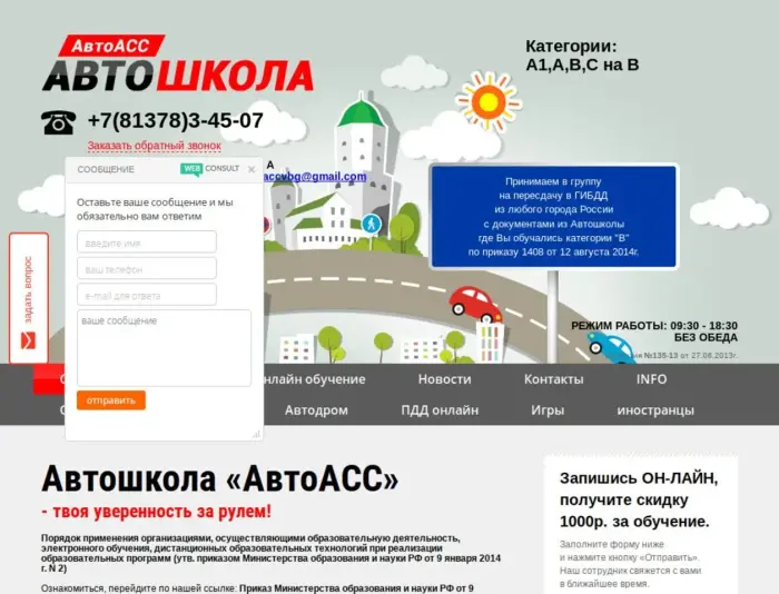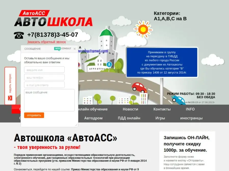 Автошкола «АвтоАСС» в Выборге:n- Гибкий график обученияn- Собственный оборудованный автодромn- Поэтапная система оплатыn- Полностью оборудованные мультимедийные классыn- Занятия по ПДД в вечернее и дневное времяn- Обучение проводят опытные инструкторы города Выборгаn- Постоянные скидки студентам, учащимся, ветеранам, инвалидам и лицам не достигшим 18-летнего возрастаn- Консультации по вопросам обучения и сдачи экзаменаn- Предоставление автодрома и автомобиля для дополнительных уроков вожденияn- Предоставление автомобиля для экзамена в МРЭО ГИБДДn- Возможна аренда классов и автодрома для частных лиц и организаций