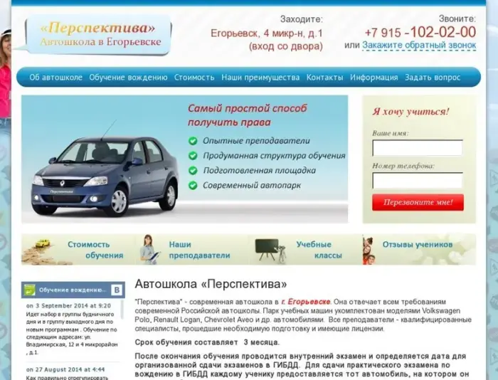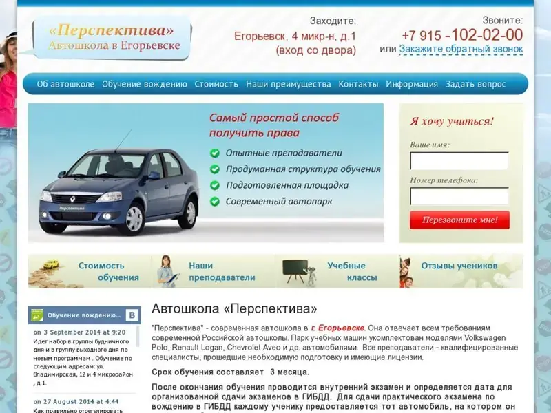 "Перспектива" - современная автошкола в г. Егорьевске. Она отвечает всем требованиям современной Российской автошколы. Парк учебных машин укомплектован моделями Volkswagen Polo, Renault Logan, Chevrolet Aveo и др. автомобилями. Все преподаватели - квалифицированные специалисты, прошедшие необходимую подготовку и имеющие лицензии.