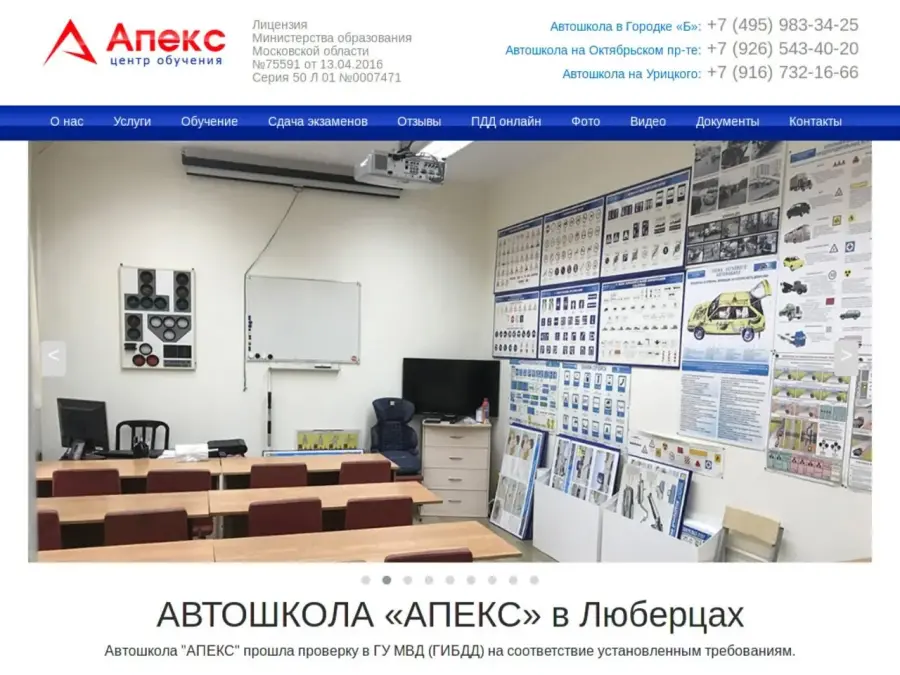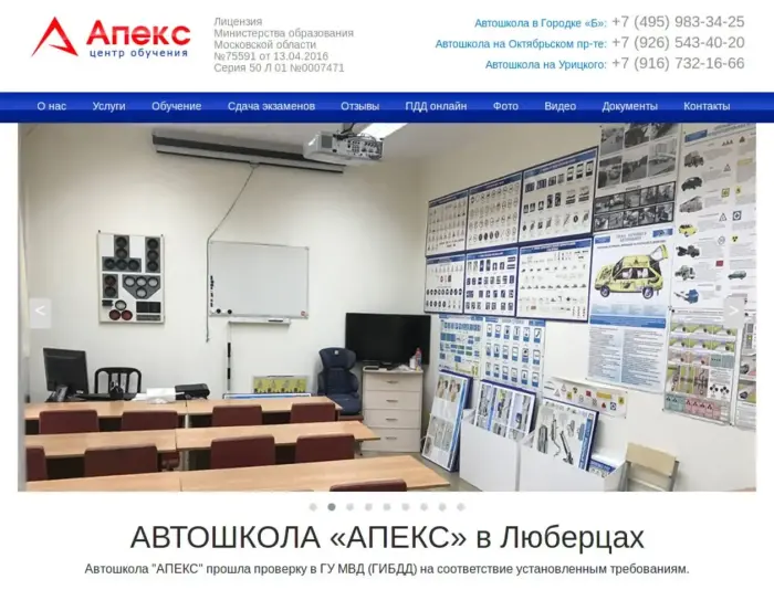 Центр обучения «АПЕКС» находится в г.Люберцы и является лицензированным учебным заведением начального профессионального и дополнительного обучения. Курсы обучения осуществляются на основании программы утвержденной Министерством образования и науки Российской федерации.nМы обеспечиваем не только высокий уровень подготовки к экзамену в ГИБДД, но и безопасное вождение в будущем. Учитывая растущую статистику ДТП, и увеличивающийся парк самих автотранспортных средств, это особенно актуально, Наша автошкола готовит водителей, которые будут уверенно чувствовать себя даже в самой сложной и неожиданной ситуации на дороге, быстро анализировать дорожную обстановку и мгновенно принимать решения. Ваша безопасность превыше всего. Учитесь вождению с «АПЕКС»!