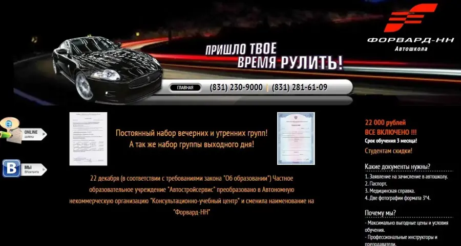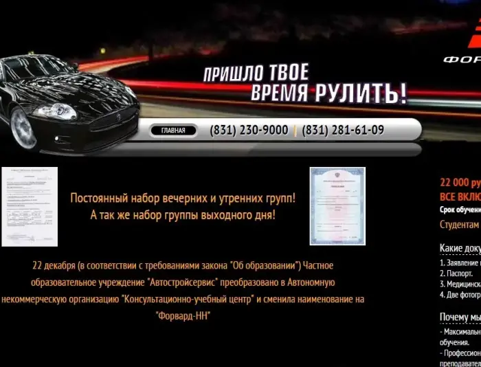 22 декабря (в соответствии с требованиями закона "Об образовании") Частное образовательное учреждение "Автостройсервис" преобразовано в Автономную некоммерческую организацию "Консультационно-учебный центр "Форвард-НН". КУЦ Форвард-НН в Нижнем Новгороде обучение вождению проводит на учебных автомобилях (отечественные и иномарки).