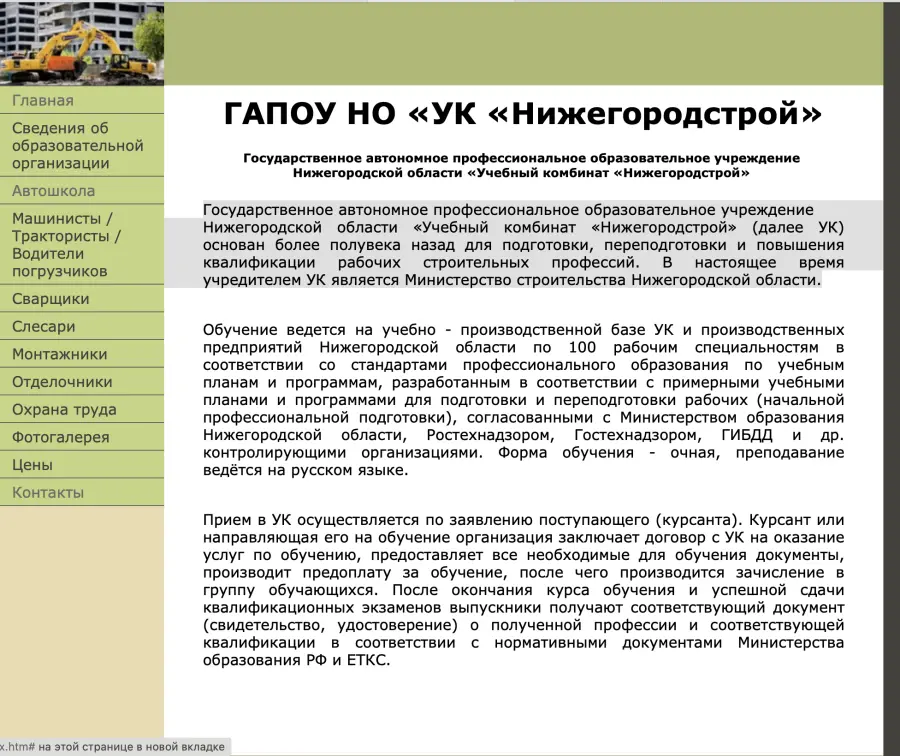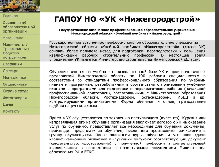 Государственное автономное профессиональное образовательное учреждение Нижегородской области «Учебный комбинат «Нижегородстрой» (далее УК) основан более полувека назад для подготовки, переподготовки и повышения квалификации рабочих строительных профессий. В настоящее время учредителем УК является Министерство строительства Нижегородской области.