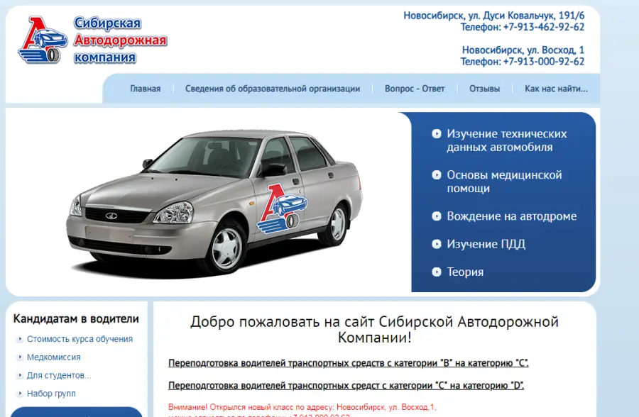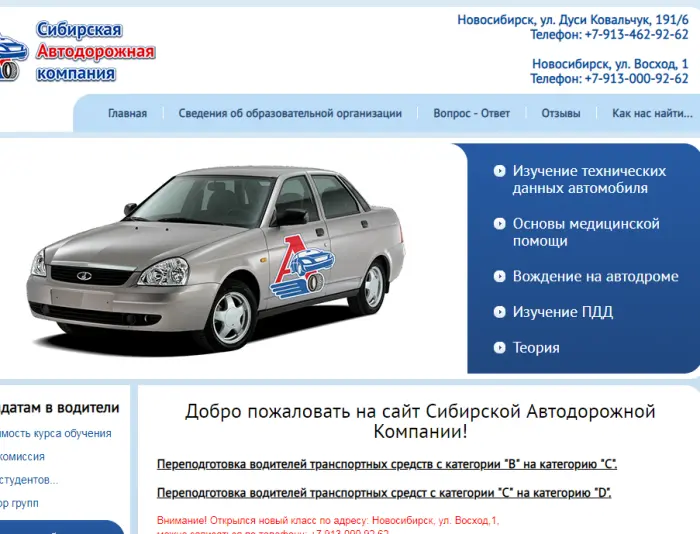 Сибирская Автодорожная Компания – это автошкола нового типа, которая предоставляет весь комплекс услуг по обучению вождению, в соответствии со всеми требованиями Российского законодательства и согласно новым обучающим программам Министерства Образования и Науки РФ.
