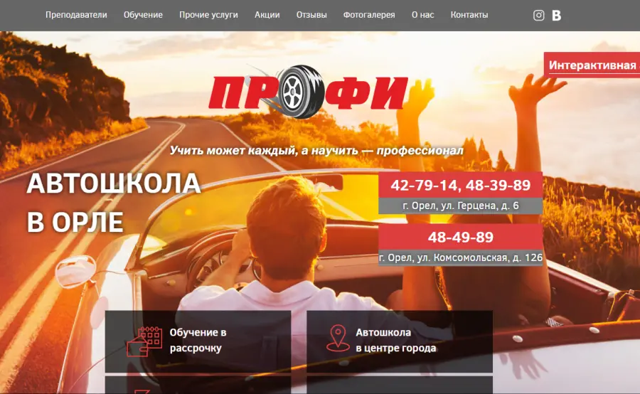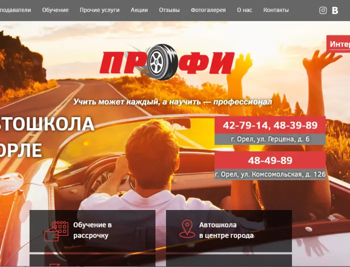 Многим наверно известно значение слова «профи». Это специалист, настоящий мастер, достигший успеха в своём деле. Это тот идеал, к которому должны стремиться все ученики, и мы стараемся помочь им достичь поставленной цели. Мы выпускаем водителей, которые водят уверенно и безопасно. Начинается обучение вождению с азов — с теории, которая преподаётся в утренние и вечерние часы в наших кабинетах. Выбрать для себя удобный график занятий может каждый наш ученик. На теории вы узнаёте не только о правилах дорожного движения — инструктор объясняет устройство автомобиля, рассказывает, как не заблудиться в чужом городе на незнакомой дороге, как избежать аварии и т.д. Для того чтобы ученики лучше усвоили материал, классы оснащены наглядными учебными пособиями, в том числе и мультимедийными. Первые практически занятия проходят на нашем собственном автодроме. Здесь вы научитесь основным элементам вождения — парковке, развороту, преодолению подъёма и т.д. Стоит отметить, что многие автошколы в Орле имеют отрицательные отзывы исключительно из-за того, что у них нет хорошо оборудованной учебной площадки. Наш же автодром по праву считается одним из лучших в Орле. Освоив азы вождения, ученик получает право под присмотром инструктора впервые выехать в город. На каждом занятии вы будете учиться применять на практике знания, которые получили на уроках и во время отработки элементов на автодроме. Мы прекрасно понимаем, что автошколы в Орле могут иметь хорошие отзывы только в том случае, если их персонал может найти индивидуальный подход к каждому ученику. И наши инструкторы знают, как обучить даже самых нервных водителей, не зависимо от пола и возраста. Мы единственная автошкола в городе, которая занимается обучением людей с ограниченными возможностями, давая им возможность свободно передвигаться по городу на машине. С нашей помощью вы сможете без проблем сдать экзамен по вождению в ГИБДД и получить долгожданное водительское удостоверение. Вы станете уверенным водителем, и перед вами в буквальном смысле слова откроются новые дороги. Вместе с нами вы станете настоящим профи вождения!