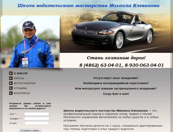 Обучение проводит опытный преподаватель и профессиональный водитель с многолетним стажем — Клеванов Михаил Александрович. Более 20 лет безаварийной езды и десятки подготовленных водителей. Михаил Александрович — создатель школы водительского мастерства, разработчик методики преподавания безаварийного управления автомобилем. Участник различных автомобильных соревнований ЦФО и России. Спортивный судья РАФ III категории.