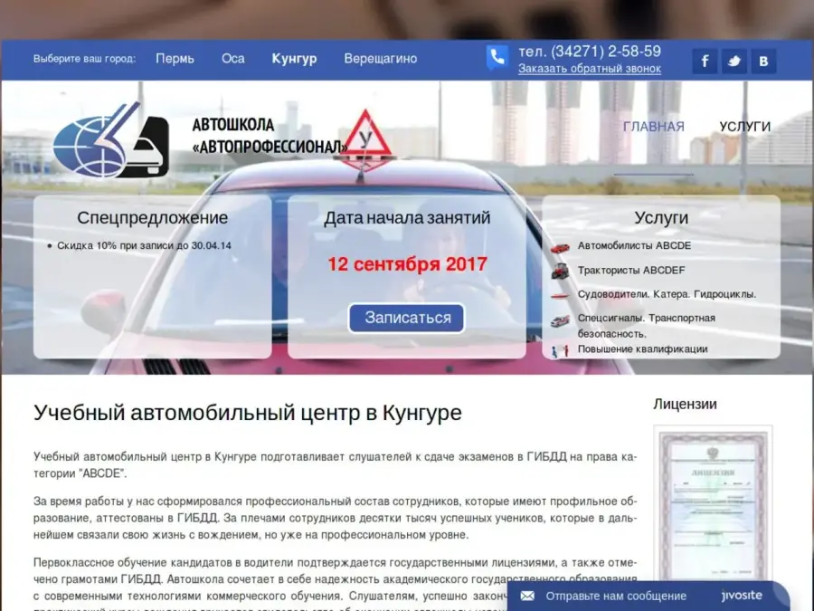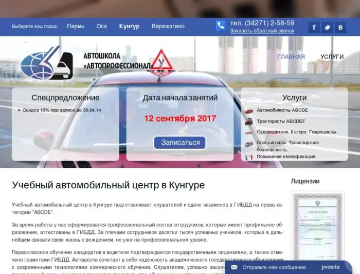 Учебный автомобильный центр в Кунгуре подготавливает слушателей к сдаче экзаменов в ГИБДД на права категории "ABCDE". За время работы у нас сформировался профессиональный состав сотрудников, которые имеют профильное образование, аттестованы в ГИБДД. За плечами сотрудников десятки тысяч успешных учеников, которые в дальнейшем связали свою жизнь с вождением, но уже на профессиональном уровне. Первоклассное обучение кандидатов в водители подтверждается государственными лицензиями, а также отмечено грамотами ГИБДД. Автошкола сочетает в себе надежность академического государственного образования с современными технологиями коммерческого обучения. Слушателям, успешно закончившим теоретический и практический курсы вождения вручается свидетельство об окончании автошколы установленного государственного образца, экзаменационная карточка водителя и предоставляется содействие в прохождении экзаменов ГИБДД. Мы работаем до вечера, что позволит вам не отпрашиваться с работы для обучения вождению. Также существует гибкая система скидок для студентов.