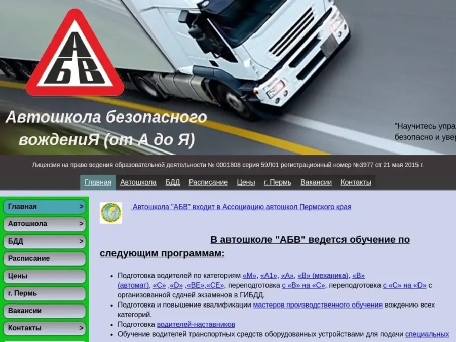 - Подготовка водителей по категориям «М», «А1», «А», «В» (механика), «В» (автомат), «С» ,«D» ,«ВЕ»,«СЕ», переподготовка с «В» на «С», переподготовка с «С» на «D» с организованной сдачей экзаменов в ГИБДД.