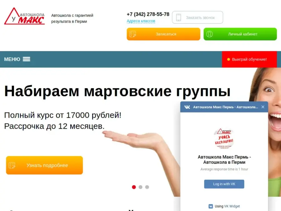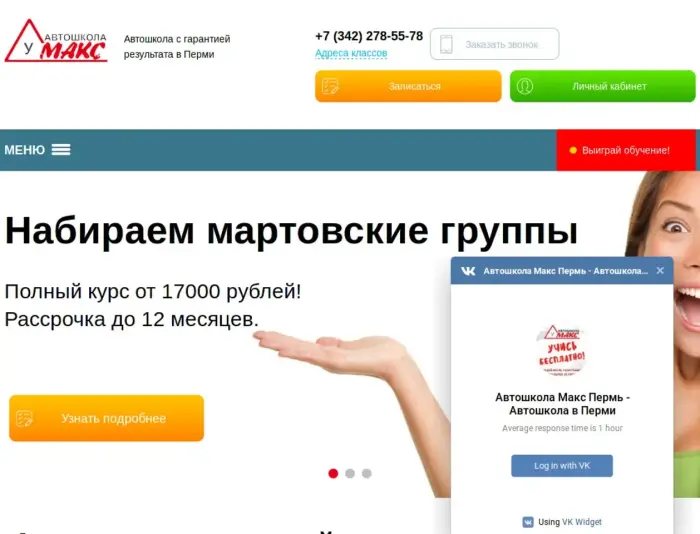 За годы продуктивной работы, подготовлено большое количество водителей и накоплен колоссальный опыт работы в данной сфере.nНа сегодняшний день школа имеет учебные классы оборудованные современными мультимедийными средствами, авто-тренажер, учебную площадку соответствующую всем требованиям и широкий парк автомобилей отечественного и иностранного производства. Теоретические занятия проводятся в утренние и вечерние часы. Так же имеется группа выходного дня. На сайте компании, для удобства слушателей, имеется видеоматериал для самостоятельной подготовки по ПДД, а также возможность проверить свои знания ПДД он-лайн. Так же предусмотрена дистанционная подготовка , посредством проведения вебинаров. Практические занятия проводятся в будние, выходные и праздничные дни, что является несомненным плюсом для слушателей автошколы «Макс». При этом стоит отметить, что выбор учебного автомобиля и времени практического занятия, остается за самим слушателем, что является еще одним плюсом для слушателя. Практический экзамен сдается на том же автомобиле, на котором кандидат в водители проходил обучение-снова плюс! Стоит так-же отметить, что в нашей школе предусмотрено предоставление учебного автомобиля, для повторной сдачи экзамена, а это говорит о том, что мы никогда не отказываемся от своих слушателей!
