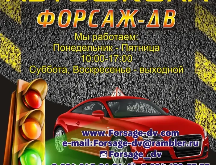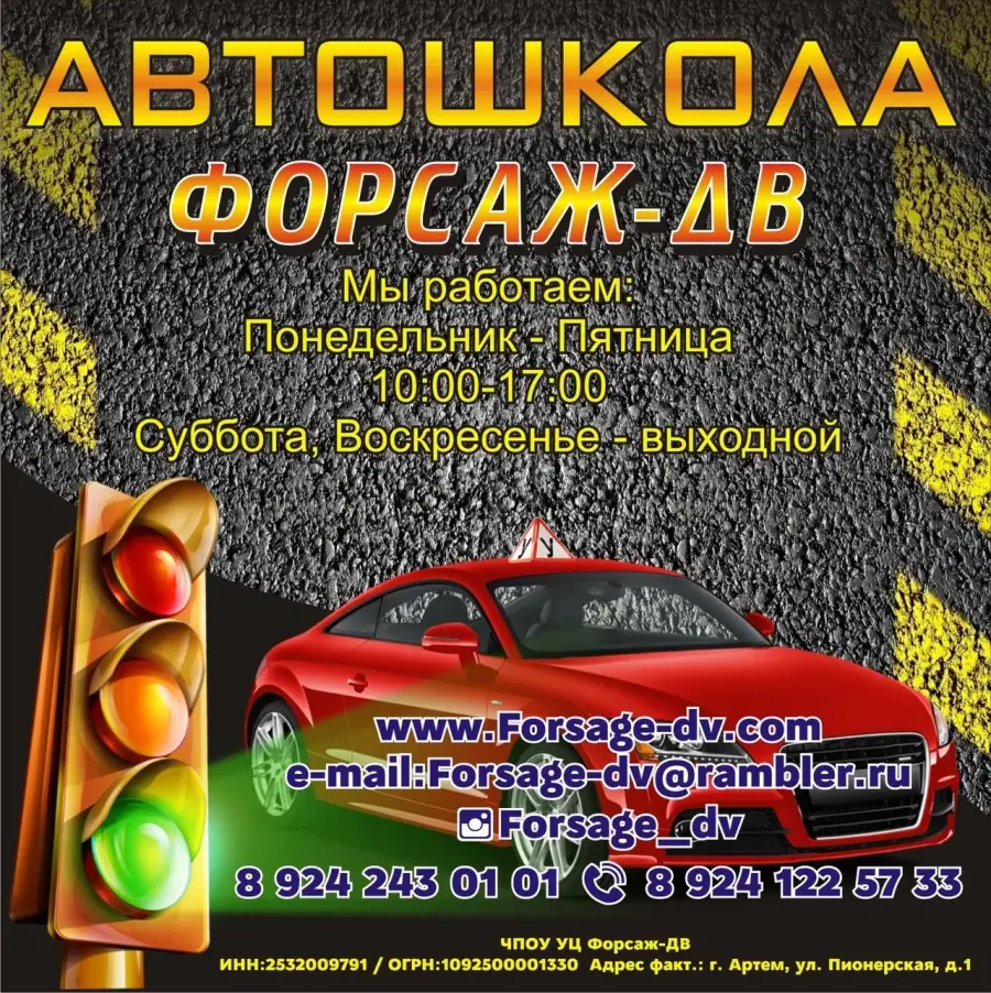 Уважаемые дамы и господа! В городе Артём открылся Учебный центр Форсаж-ДВ! Обучение вождению на категорию «В». Наши преподаватели и мастера производственного обучения обучат Вас всем особенностям безопасного и качественного управления транспортным средством . Подход к каждому ученику индивидуален. Обучение происходит как на автоматической так и на механической коробке передач. Автодром(закрытая площадка) оборудован согласно всем требованиям.