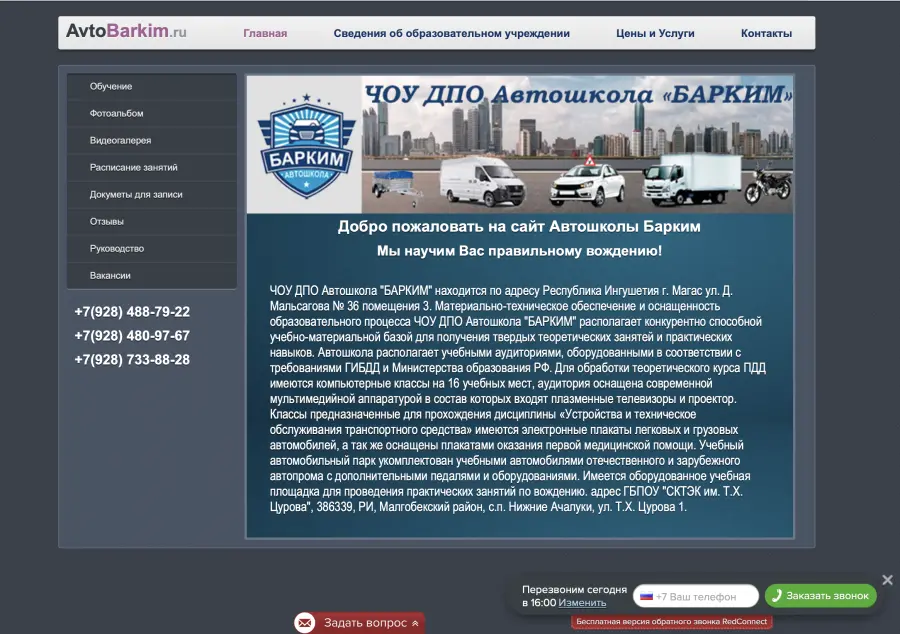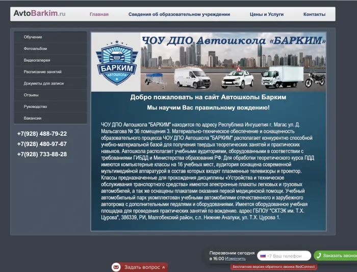 ОУ ДПО Автошкола "БАРКИМ" находится по адресу Республика Ингушетия г. Магас ул. Д. Мальсагова № 36 помещения 3. Материально-техническое обеспечение и оснащенность образовательного процесса ЧОУ ДПО Автошкола "БАРКИМ" располагает конкурентно способной учебно-материальной базой для получения твердых теоретических занятей и практических навыков. Автошкола располагает учебными аудиториями, оборудованными в соответствии с требованиями ГИБДД и Министерства образования РФ. Для обработки теоретического курса ПДД имеются компьютерные классы на 16 учебных мест, аудитория оснащена современной мультимедийной аппаратурой в состав которых входят плазменные телевизоры и проектор. Классы предназначенные для прохождения дисциплины «Устройства и техническое обслуживания транспортного средства» имеются электронные плакаты легковых и грузовых автомобилей, а так же оснащены плакатами оказания первой медицинской помощи. Учебный автомобильный парк укомплектован учебными автомобилями отечественного и зарубежного автопрома с дополнительными педалями и оборудованиями. Имеется оборудованное учебная площадка для проведения практических занятий по вождению. адрес ГБПОУ "СКТЭК им. Т.Х. Цурова", 386339, РИ, Малгобекский район, с.п. Нижние Ачалуки, ул. Т.Х. Цурова 1.