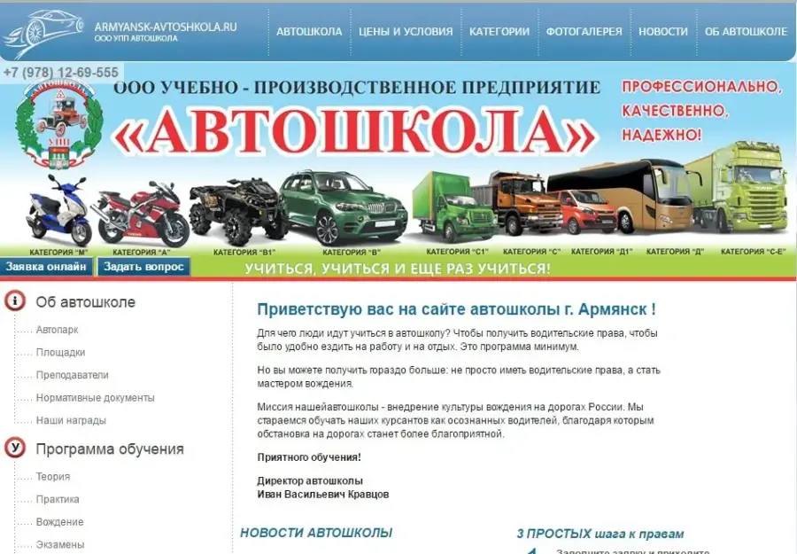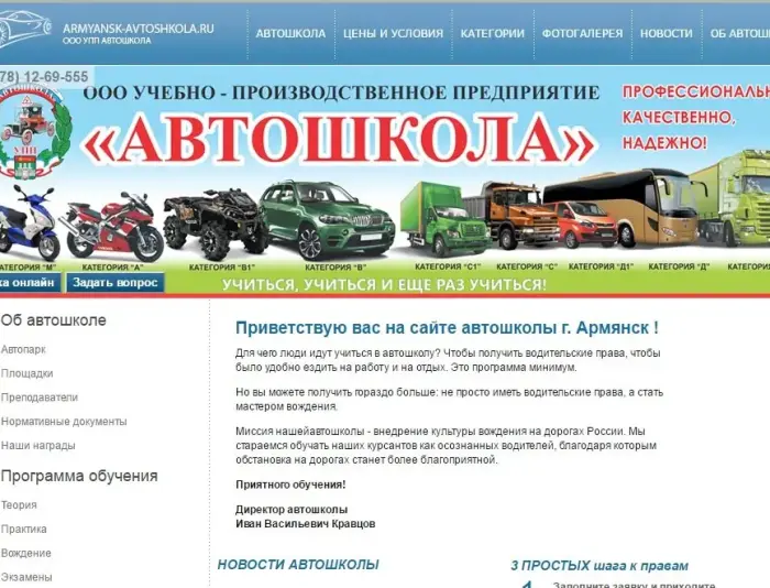Автошкола города Армянск приглашает Вас на курсы подготовки водителей категории A, В, С, D, E , а также на курс подготовки вождению квадроцикла. С момента основания в 1994 наша автошкола году накопила огромный опыт подготовки водителей высокого уровня как теоретических знаний, так и навыков вождения автомобиля. Мы не просто научим вас водить, мы полностью ознакомим вас с таким сложным устройством, как автомобиль, научим справляться со стрессом, который зачастую возникает у людей, только-только севших за руль, и будем сопровождать вас от и до в таком сложном процессе, как получение прав.