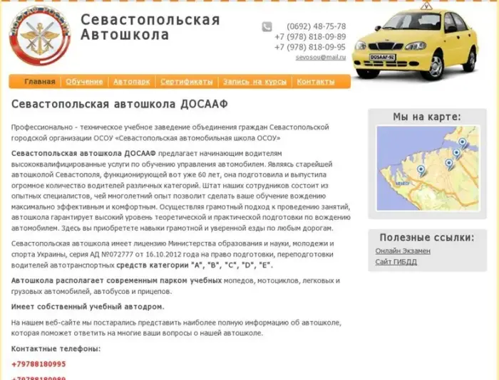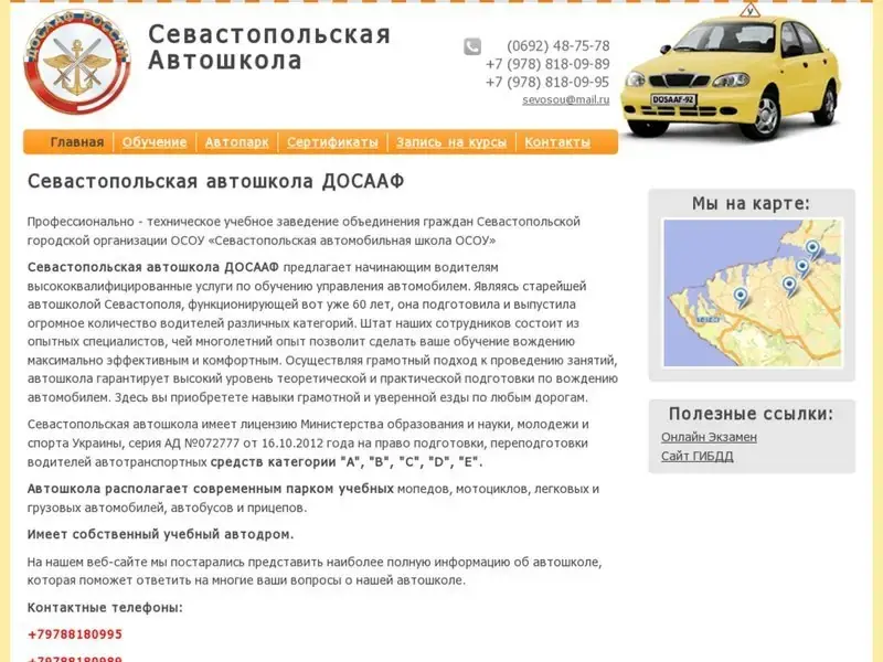 Севастопольская автошкола ДОСААФ предлагает начинающим водителям высококвалифицированные услуги по обучению управления автомобилем. Являясь старейшей автошколой Севастополя, функционирующей вот уже 60 лет, она подготовила и выпустила огромное количество водителей различных категорий. Штат наших сотрудников состоит из опытных специалистов, чей многолетний опыт позволит сделать ваше обучение вождению максимально эффективным и комфортным. Осуществляя грамотный подход к проведению занятий, автошкола гарантирует высокий уровень теоретической и практической подготовки по вождению автомобилем. Здесь вы приобретете навыки грамотной и уверенной езды по любым дорогам.