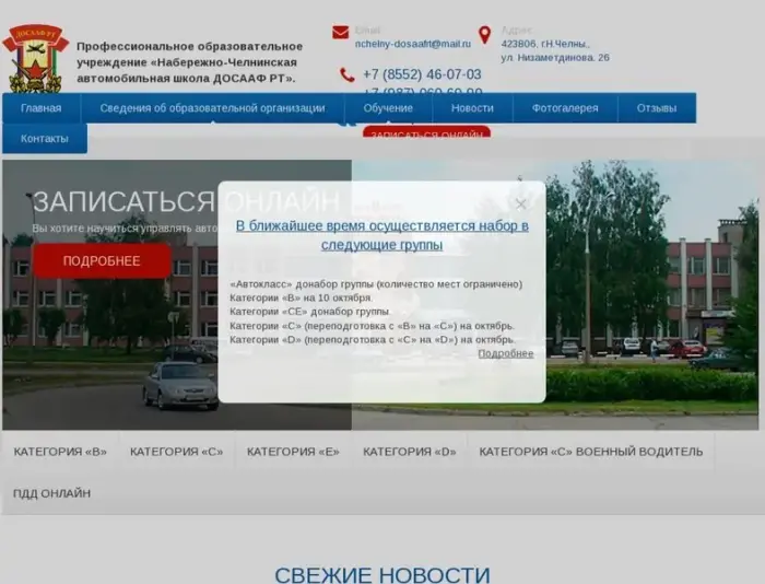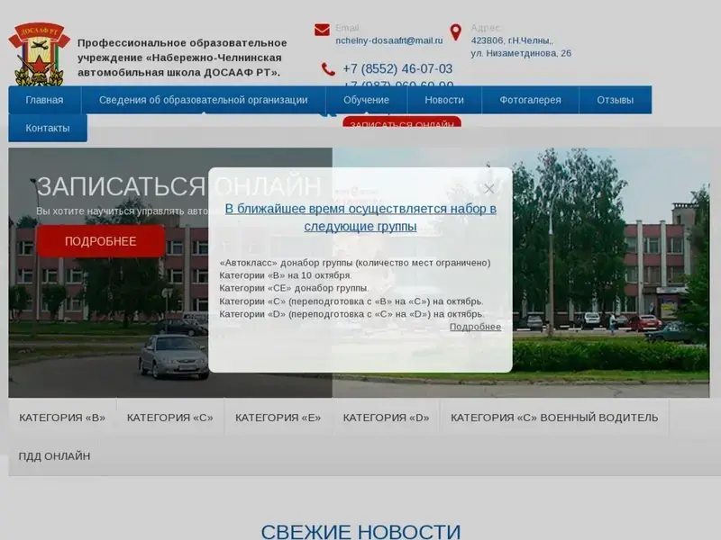 Набережночелнинская автошкола РОГО ДОСААФ РТ была открыта в 1976 году на базе военно-технического комплекса КАМАЗа согласно приказу Председателя ЦК ДОСААФ СССР Александра Ивановича Покрышкина. Основными задачами автомобильной школы является военно-патриотическое воспитание граждан, развитие авиационных, технических и военно-прикладных видов спорта, подготовка призывной молодежи по военно-учетной специальности ВУС-837 – водитель автомобиля категории «С» для Вооруженных Сил РФ. Решение этих задач осуществляется под руководством исполнительного комитета муниципального образования г.Набережные Челны, РОГО ДОСААФ РТ совместно с отделами военных комиссариатов РТ по г.Набережные Челны и Тукаевскому району, что позволяет ежегодно успешно выполнять план подготовки специалистов по ВУС-837. Сегодня также основными направлениями в деятельности школы являются: подготовка водителей транспортных средств категорий «В», «ВЕ», «С» и «СЕ», и переподготовка с категории «В» на категорию «С», с "С" на "В", с «С» на «Д»; совместная работа с городским Центром занятости населения по реализации Правительственной программы по снятию напряженности на рынке труда, а также по обучению старшеклассников образовательных школ профессии водителя транспортных средств категории "В". Процесс обучения в автошколе тесно связан своспитательной работой. Большую роль в военно-патриотическом воспитании молодежи играет воссозданный в школе музей истории и Боевой славы автомобильных войск. В процессе обучения курсанты знакомятся с экспозициями музея, встречаются с ветеранами Великой Отечественной войны, участниками войн в Афганистане и Чеченской Республике, с выпускниками автошколы, ветеранами РОСТО (ДОСААФ). Музей является центром военно-патриотического воспитания для учащихся СОШ г.Набережные Челны.