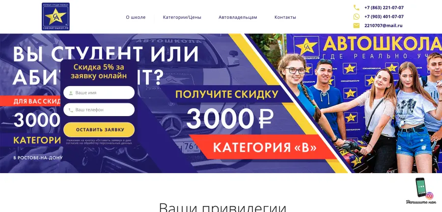 Автошкола “С.А” Союз Автошкол - больше чем автошкола, это многопрофильная компания с высоким качеством предоставляемых услуг, созданная для повышения качества образовательных услуг и снижения количества ДТП в городе Ростове-на-Дону и Ростовской области. Мы готовы предложить Вам самое высокое качество обучения по самым демократичным ценам. Только у нас: Обучение на все категории: «А», «В», «С», «D», «Е», «М», квадроциклы, трактора и спецтехнику. Возможность обучения теории ПДД онлайн! Права за 45 дней! Категория "В" от 9 990 руб.! Рассрочка без % и переплат Минимальный первоначальный взнос от 900 руб. Собственный автодром и автопарк из более чем 60 единиц современной авто и мото-техники Бессрочная лицензия и аккредитация ГИБДД Практическое вождение в удобное для Вас время с 07:00 до 20:00 ежедневно, включая субботу и воскресенье Дипломированные инструктора и возможность выбора авто Теоретические занятия в утреннее, дневное и вечернее время, группы выходного дня; Есть возможность прослушать курс лекций после окончания обучения в течение года совершенно БЕСПЛАТНО Широкий ассортимент дополнительных услуг для автовладельцев: Индивидуальное вождение на МКПП и АКПП; Замена водительского удостоверения; Договор купли-продажи автомобиля; Направление на техосмотр и ОСАГО; Карты для тахографа; и другие услуги для автовладельцев. Мы не боимся сравнений!