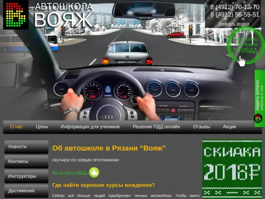 Автошкола «Вояж» является одной из наиболее посещаемых и стремительно развивающихся автошкол города. На данный момент в нашем арсенале 3 хорошо оснащенных и удобно расположенных учебных классов в различных районах Рязани, современный автопарк учебных автомобилей Рено Логан, автодром, отвечающий всем требованиям проведения учебного процесса.