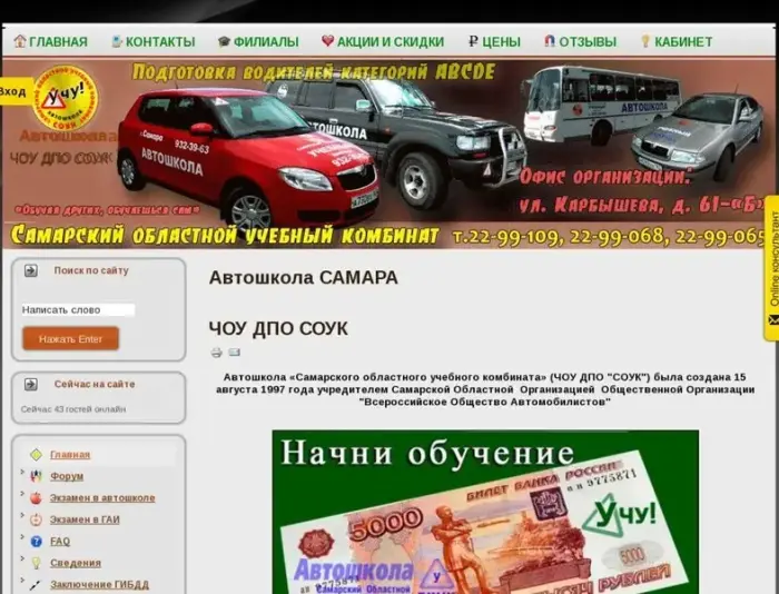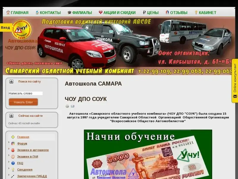 Автомобильная Школа с богатой историей и традициями. ЧОУ ДПО "САМАРСКИЙ ОБЛАСТНОЙ УЧЕБНЫЙ КОМБИНАТ" крупнейшая автошкола в Самарской области, созданная учредителем Самарской Областной Организацией Общественной Организации "Всероссийское Общество Автомобилистов" (ВОА). Люди во всём регионе знают нашу автошколу и доверяют нам. Много лет мы занимаем лидирующие позиции в подготовке водителей, участвуем в общественной деятельности города, работаем над безопасностью дорожного движения. Наша задача - привить грамотное поведение, знание и понимание дорожного движения всем участникам, как водителям, так и пешеходам. Большую роль мы отводим воспитанию культурного водителя и пешехода с детства. Интенсивная работа с детьми, проведение различных конкурсов и соревнований, организация молодежных мероприятий, позволяет лучше понять и усвоить Правила и Безопасность Дорожного Движения. - Фиксированные цены, без доплат и скрытых платежей - Беспроцентная рассрочка платежа до 6 месяцев - Гибкий график работы (утренние и вечерние занятия, есть группа выходного дня) - Собственный автодром - Выбор автомобиля - Экзамен ГИБДД принимается на автомобилях автошколы - Возможность "Онлайн" обучения - Возможность "Ускоренного курса" - Возможность приобретения "Подарочного сертификата"