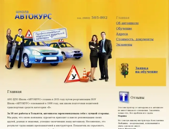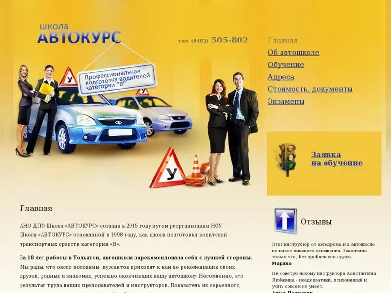 НОУ Школа «АВТОКУРС» основана в 1998 году, как школа подготовки водителей транспортных средств категории «В». За 16 лет работы в Тольятти, автошкола зарекомендовала себя с лучшей стороны. Мы рады, что около половины курсантов приходят к нам по рекомендации своих друзей, родных и знакомых, успешно окончивших нашу автошколу. Несомненно, это результат труда наших преподавателей и инструкторов. Показатель их серьезного, ответственного отношения к своей работе. В нашей автошколе теоретическое обучение проводится в специально оборудованных классах с использованием учебно-методических, а также учебно-наглядных пособий, позволяющих быстрее, а главное качественнее овладеть учебным материалом. Практическое обучение вождению проходит на автоматизированном автодроме, а также на улицах города. По окончании обучения, в автошколе проводится внутренний экзамен, который отражает реальную картину Вашей подготовки. Курсанты, успешно сдавшие внутренний экзамен, отправляются сдавать экзамены в ГИБДД г. Тольятти. Политика автошколы состоит в том, чтобы каждый курсант овладел в полной мере искусством вождения. Мы стараемся учить будущих водителей быть внимательными за рулем и вежливыми по отношению к другим участникам дорожного движения.