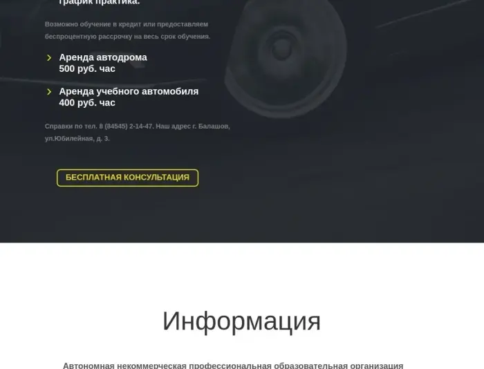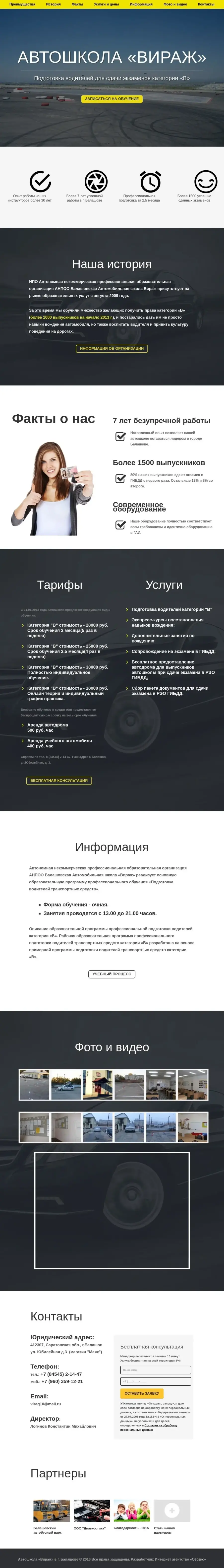 Частное образовательное учреждение дополнительного профессионального образования и профессиональной подготовки "Балашовская автомобильная школа "Вираж" присутствует на рынке образовательных услуг с августа 2009 года, и за это время мы обучили множество желающих получить права категории «В» (более 1000 выпускников на начало 2013 г.), и постарались дать им не просто навыки вождения автомобиля, но также воспитать грамотного водителя и привить культуру поведения на дорогах, уважение к другими участниками дорожного движения. Мы уверены в том, что из наших учеников получились, получаются, и мы надеемся, будут получаться грамотные водители. Весь коллектив нашей Автошколы являются водителями, и пешеходами и мы заинтересованы в том, чтобы культура вождения и культура поведения была на высоком уровне, так как сами можем встретиться на дороге со своими бывшими учениками. У нас работают высококвалифицированные преподаватели с многолетним стажем а также квалифицированные (и что немаловажно спокойные) инструктора. Обучение в нашей автошколе ориентировано на людей которые не имеют абсолютно никаких навыков вождения и не разу не садились за руль автомобиля. Но если Вы уже имели опыт вождения до поступления в нашу Автошколу, то мы доведем Ваши навыки до уровня, необходимого для получения водительского удостоверения в МРЭО ГИБДД . Автопарк нашей Автошколы составляют передне- и заднеприводные автомобили отечественного производства ВАЗ1118 , ВАЗ 2115, ВАЗ 2106, ВАЗ 2110, ВАЗ 2114.
