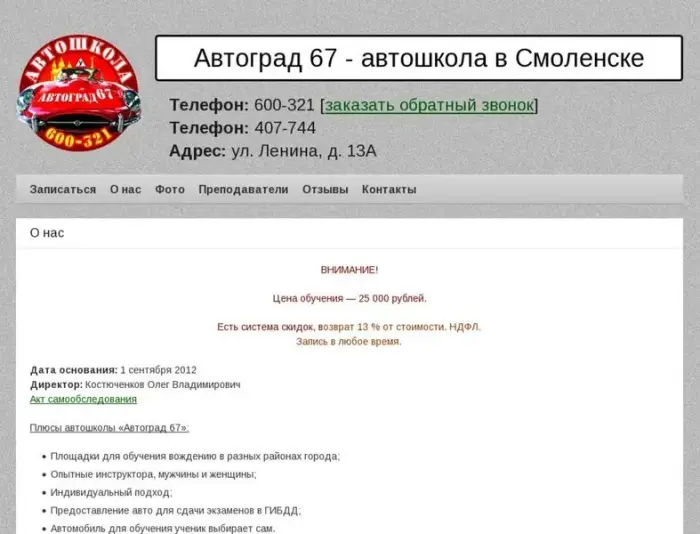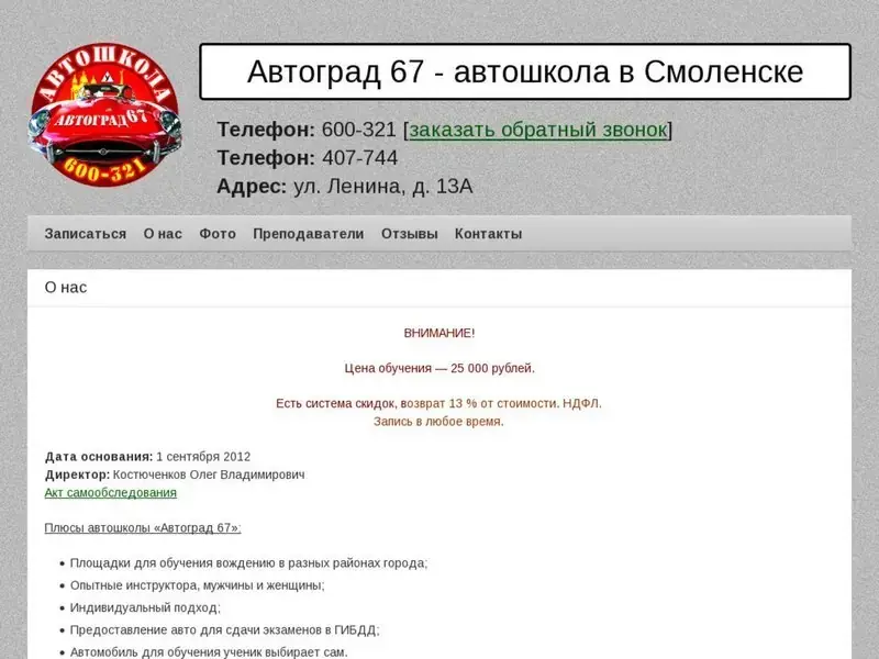«Автоград 67» — автошкола в Смоленске, основным направлением деятельности которой является подготовка водителей категории «B». Несмотря на небольшой срок функционирования нашей школы, мы гарантируем вам получение не только знаний ПДД, основ управления транспортным средством и безопасности движения, основ оказания первой медицинской помощи, основ устройства и технического обслуживания автомобиля, нормативно-правовой базы в соответствующей сфере, но и приобретение навыков правильного, безопасного и безаварийного вождения на должном уровне. Ваше качественное обучение обеспечивают опытные и профессиональные инструктора по вождению, а также высококвалифицированные преподаватели теории. Разъяснение теории осуществляется в спокойной и доброжелательной обстановке, вся информация предоставляется на ясном, четком и доступном уровне с использованием разнообразных учебных материалов: видео уроков, плакатов, сборников экзаменационных билетов.