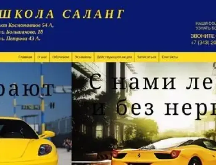 Негосударственное образовательное частное учреждение дополнительного профессионального образования «Саланг» осуществляет образовательную деятельность в г.Екатеринбурге с 2010 г. За этот срок Автошколой подготовлено несколько тысяч водителей транспортных средств категорий "B". Высокий профессионализм и большой опыт преподавательского состава позволяют Автошколе оставаться одним из самых востребованных образовательных учреждений. Наши учащиеся получают возможность пройти курсы профессиональной подготовки водителей по категории "В", получить знания связанные с изучением правил дорожного движения с применением самого современного технического оснащения, ознакомиться с техническим обслуживанием транспортных средств, а также научиться правилам и умениям в оказания первой медицинской помощи. Практическое вождение осуществляется на специально оборудованных современных учебных автомобилях на площадке первичного вождения и по утвержденному маршруту в городе.
