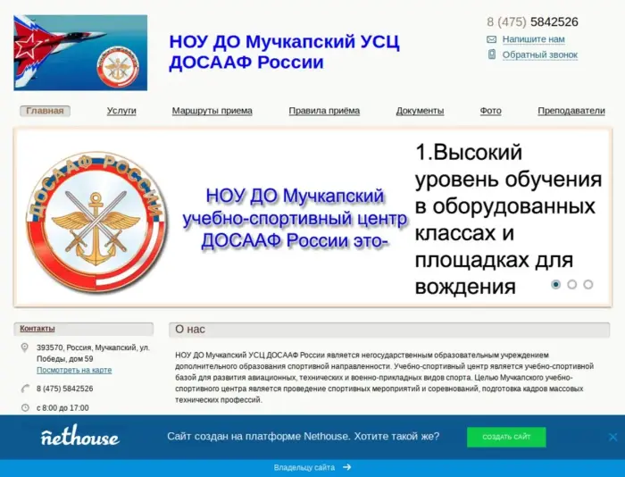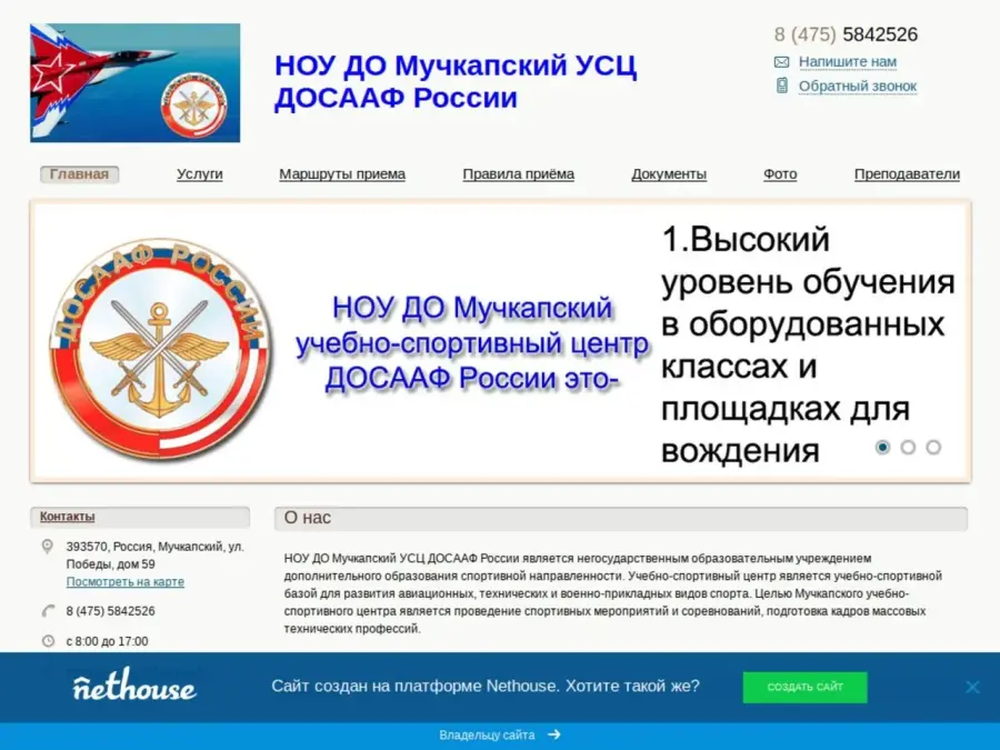 НОУ ДО Мучкапский УСЦ ДОСААФ России является негосударственным образовательным учреждением дополнительного образования спортивной направленности. Учебно-спортивный центр является учебно-спортивной базой для развития авиационных, технических и военно-прикладных видов спорта. Целью Мучкапского учебно-спортивного центра является проведение спортивных мероприятий и соревнований, подготовка кадров массовых технических профессий.