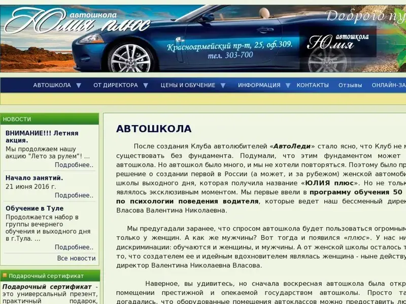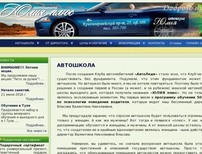 Клуб «АвтоЛеди» из Тулы стал популярным среди жителей города, но с самого начала стало понятно: ему нужна основа, которая объединит вокруг себя единомышленников. И точкой опоры, вокруг которой смогли собраться десятки людей, стала профессиональная автошкола. Однако, это не обычное, а специализированное заведение: первое в своём роде в России, а быть может – и во всём мире. Ведь это – первая женская автошкола в Туле выходного дня! Впрочем, формат обучения стал не единственным ноу-хау: наша организация стала первой в своём роде, где целых 50 часов курсантов обучают психологии вождения. Естественно, такой подход привлёк не только прекрасный пол: очень скоро в нашу автошколу потянулись и мужчины. У нас нет никакой дискриминации: кто хочет, тот и занимается.