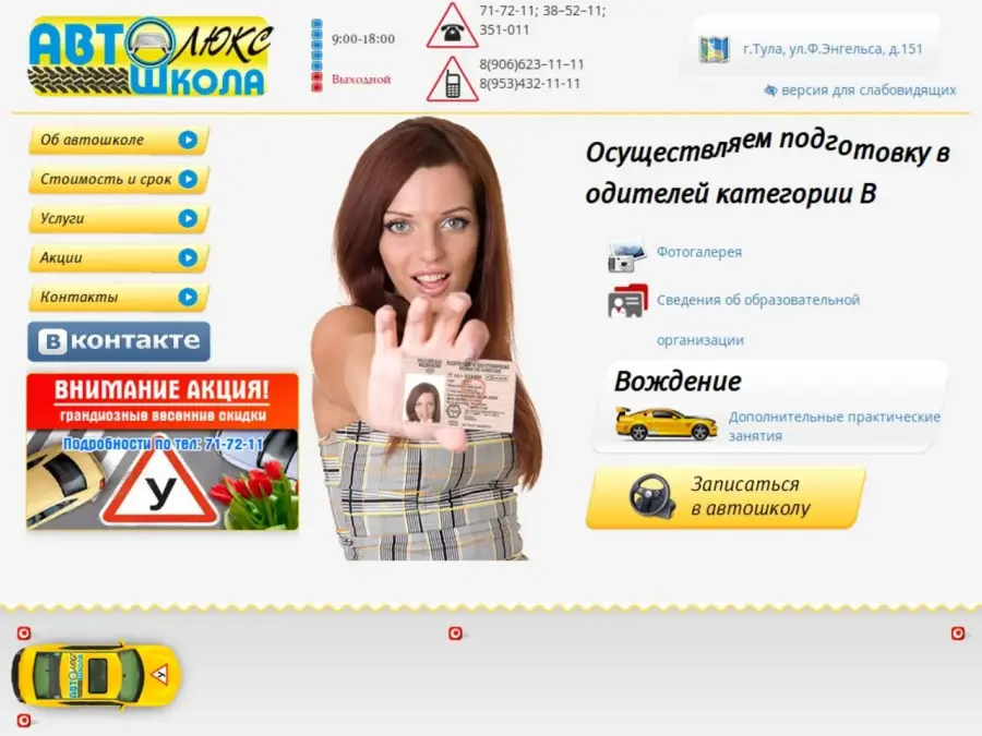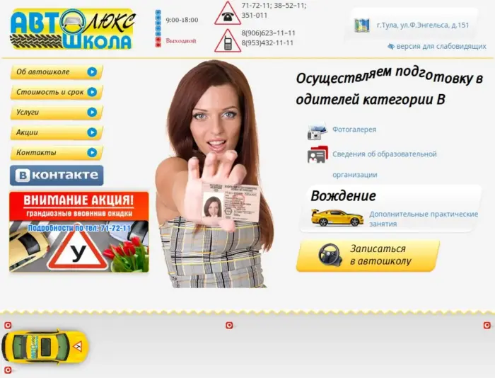 Наша автошкола в Туле - это комфортные и оборудованные комьютерами, интерактивными стендами, необходимым методическим и наглядным материалом кабинеты для проведения занятий теоретического курса, ну и конечно же учебные автомобили: иномарки и отечественные. Наша главная цель состоит в том, чтобы Вы не только успешно сдали экзамены в ГИБДД и получили водительское удостоверение, но и уверенно чувствовали себя за рулем на дорогах. Хотя бы потому, что мы будем вместе по ним передвигаться! Итогом нашей работы являются всегда отличные результаты на экзаменах и благодарность выпускников, которые рекомендуют нашу автошколу своим знакомым! Наша автошкола проводит курсы по подготовке водителей транспортных средств категорий "В". Занятия проводятся в дневное, вечернее время. Предусмотрена индивидуальная подготовка и группа выходного дня. Автошкола «АвтоЛюкс» - профессиональное обучение вождению в лучшее для Вас время!