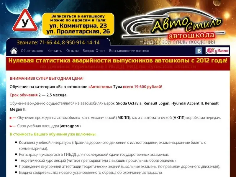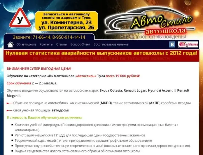 Автошкола «Автостиль» проводит профессиональное обучение водителей категории «В» в Туле. Вам будет приятно проходить обучение в компании, где главным критерием является только качество образования и профессионализм в работе с каждым нашим клиентом, где внимательно отнесутся не только к особенностям Вашего графика работы или учёбы, но и к Вашим личным предпочтениям. Здесь не занимаются бестолковым заучиванием «для галочки». У нас Вы можете быть уверенны, что платите только за качественную и профессиональную подготовку, ведь каждый наш преподаватель и автоинструктор — это ас своего дела, ориентированный на качество Вашей профессиональной подготовки.