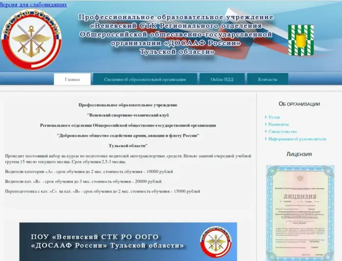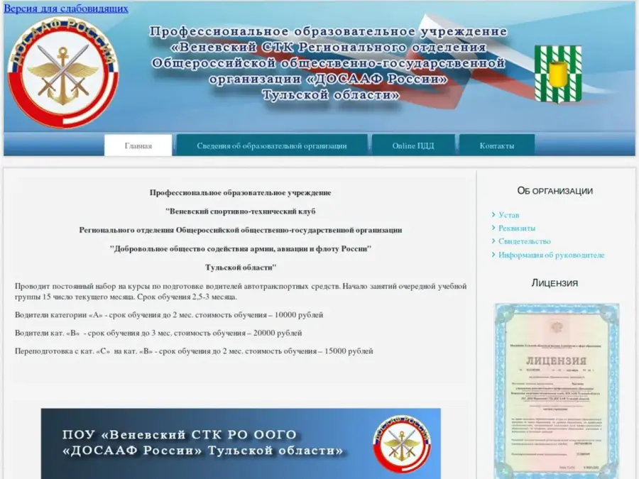Частное учреждение дополнительного профессионального образования Веневский спортивно-технический клуб ДОСААФ Тульской области (ЧУ ДПО Веневский СТК ДОСААФ Тульской области) сохраняет и продолжает традиции оборонной организации. Наше кредо: готовим грамотных и безопасных водителей транспортных средств.