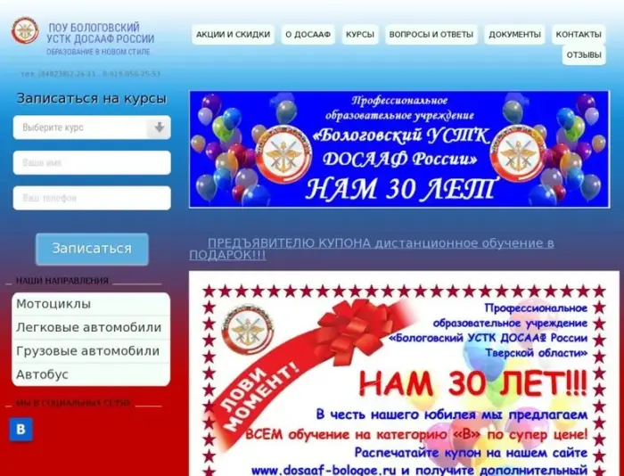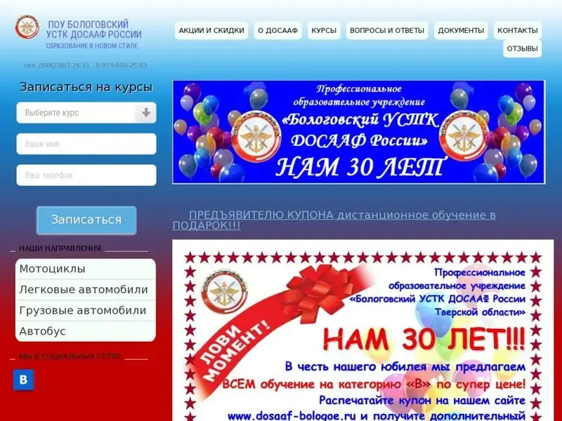 БОЛОГОВСКИЙ УЧЕБНЫЙ СПОРТИВНО-ТЕХНИЧЕСКИЙ КЛУБ содействует укреплению обороноспособности страны, проводит военно-патриотическую работу среди населения, развивает технические и военно-прикладные виды спорта, проводит подготовку граждан по массовым техническим профессиям. Одним из направлений является подготовка водителей различных категории на курсах ДОСААФ.