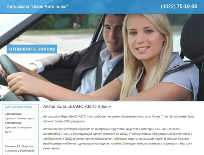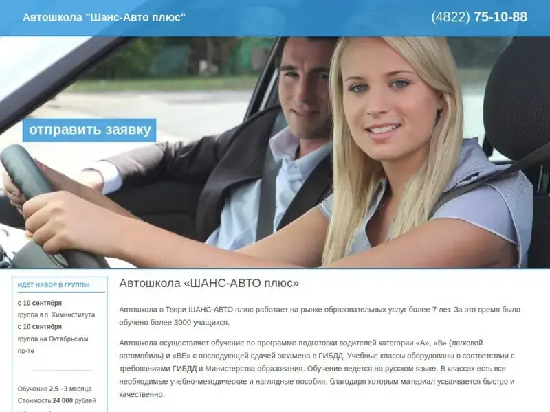 Автошкола в Твери ШАНС-АВТО плюс работает на рынке образовательных услуг более 7 лет. За это время было обучено более 3000 учащихся. Автошкола осуществляет обучение по программе подготовки водителей категории «В» (легковой автомобиль) с последующей сдачей экзамена в ГИБДД. Учебные классы оборудованы в соответствии с требованиями ГИБДД и Министерства образования. Обучение ведется на русском языке. В классах есть все необходимые учебно-методические и наглядные пособия, благодаря которым материал усваивается быстро и качественно.