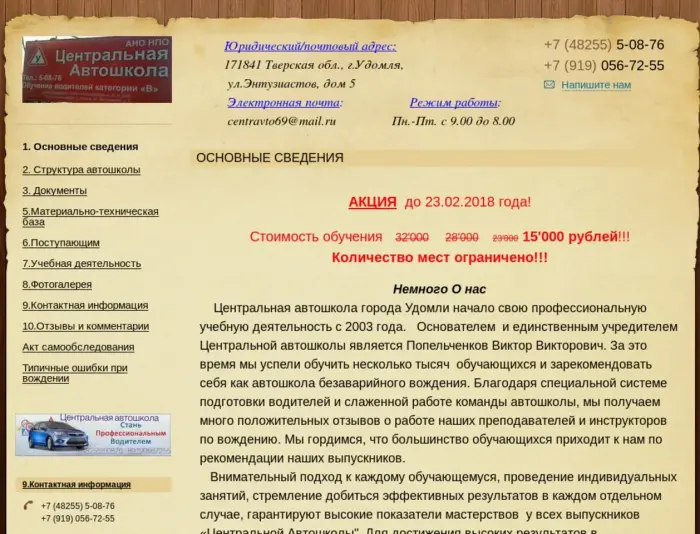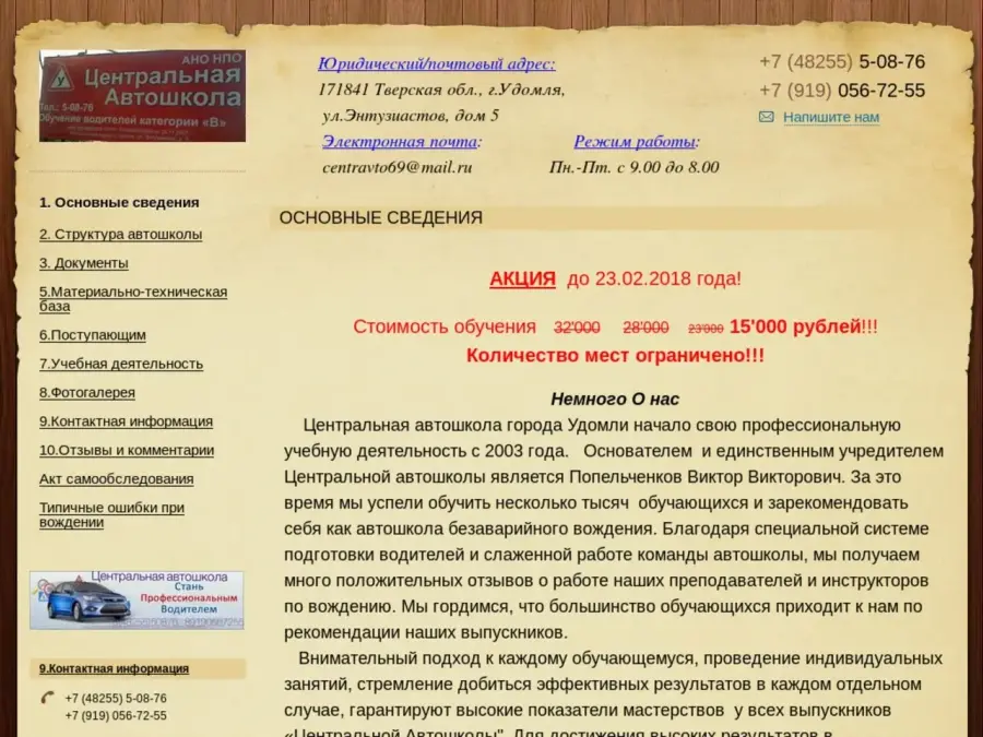 Мы рады приветствовать на сайте Центральной автошколы города Удомля. Наша автошкола была основана в 2003 г. группой энтузиастов и профессианалов своего дела, которые долгие годы для вас совершенствовали культуру и мастерство вождения. Собрав опытную команду инструкторов и преподавателей мы поставили себе одну главную цель: сделать вождение в городе легким и доступным для всех и каждого, не зависемо от уровня его подготовки передать начинающим и неопытным водителям все свои профессиональные навыки и знания, чтобы в водительском кресле вы себя чувствовали уверенно и безопастно! Автошкола осуществляет подготовку и обучение водителей на категорию "B", а так же восстановление утраченных навыков вождения автомобилем. Мы имеем все предусмотренные законом разрешения и лицензию на осуществления образовательной деятельности.