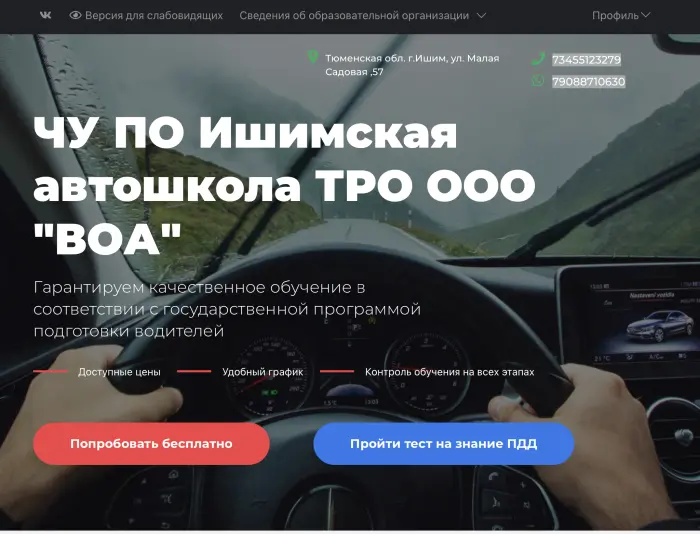 НОУ Ишимская автошкола ВОА в течение многих лет проводит подготовку водителей категорий «В», а также обучение по другим направлениям: - Повышения квалификации водителей (классность); - Ежегодные занятия с водителями ТС по 20-ти часовой программе; - Водитель-наставник; - Водитель по перевозке ОГ (ДОПОГ); - Подготовка специалистов по безопасности движения (БД); - Машинист крана автомобильного; - Стропальщик.