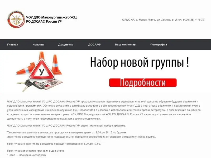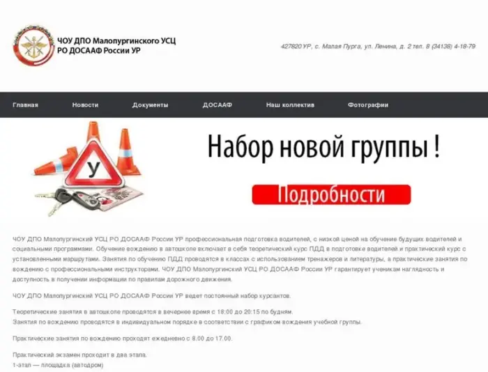 ЧОУ ДПО Малопургинский УСЦ РО ДОСААФ России УР профессиональная подготовка водителей, с низкой ценой на обучение будущих водителей и социальными программами. Обучение вождению в автошколе включает в себя теоретический курс ПДД в подготовке водителей и практический курс с установленными маршрутами. Занятия по обучению ПДД проводятся в классах с использованием тренажеров и литературы, а практические занятия по вождению с профессиональными инструкторами. ЧОУ ДПО Малопургинский УСЦ РО ДОСААФ России УР гарантирует ученикам наглядность и доступность в получении информации по правилам дорожного движения. ЧОУ ДПО Малопургинский УСЦ РО ДОСААФ России УР ведет постоянный набор курсантов.