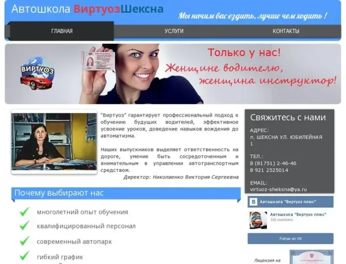 "Почему выбирают нас - многолетний опыт обучения - квалифицированный персонал - современный автопарк - гибкий график занятий - имеется автомобиль с ручным управлением - женщине водителю - женщина инструктор!