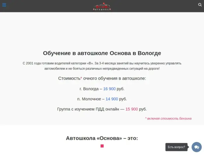 Производит обучение водителей категории «В». Наша организация основана в декабре 2001 года и является одной из первых частных автошкол г. Вологды. Название школы «Основа» связано с тем, что автошкола дает основу знаний и навыков, а оттачивать мастерство водитель должен на протяжении всей своей жизни. Обучение вождению проводится в удобное время на автомобилях Лада Ларгус и ВАЗ-2113 (на этом автомобиле обучает женщина-инструктор) опытными, терпеливыми, некурящими, непьющими мастерами производственного обучения. Учебная площадка находится в непосредственной близости к экзаменационному маршруту. Продолжительность обучения около трех месяцев. После прохождения теоретического курса и практического вождения в количестве 50 часов организованная сдача в ГИБДД до момента получения водительского удостоверения. По желанию учащегося можно увеличить срок обучения без дополнительной оплаты.