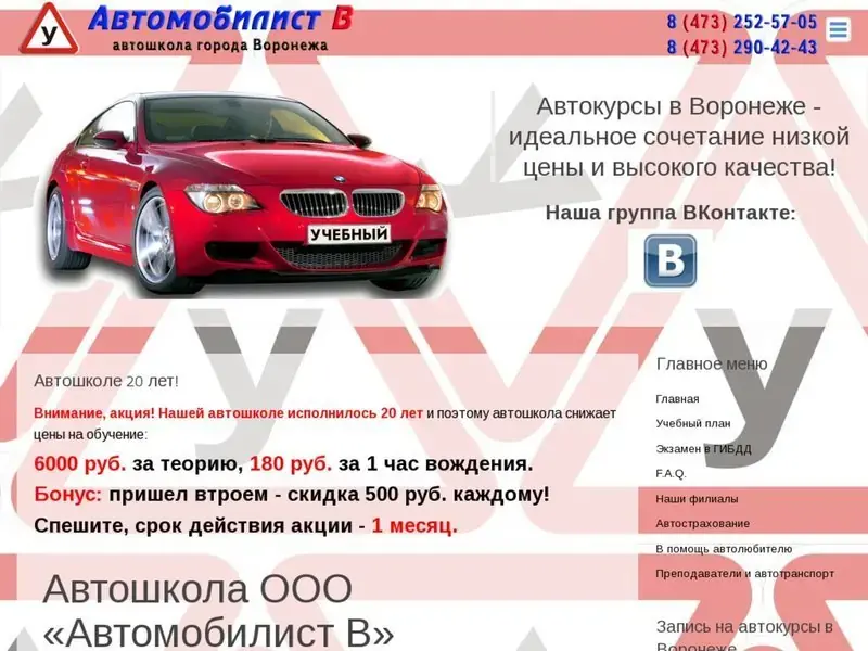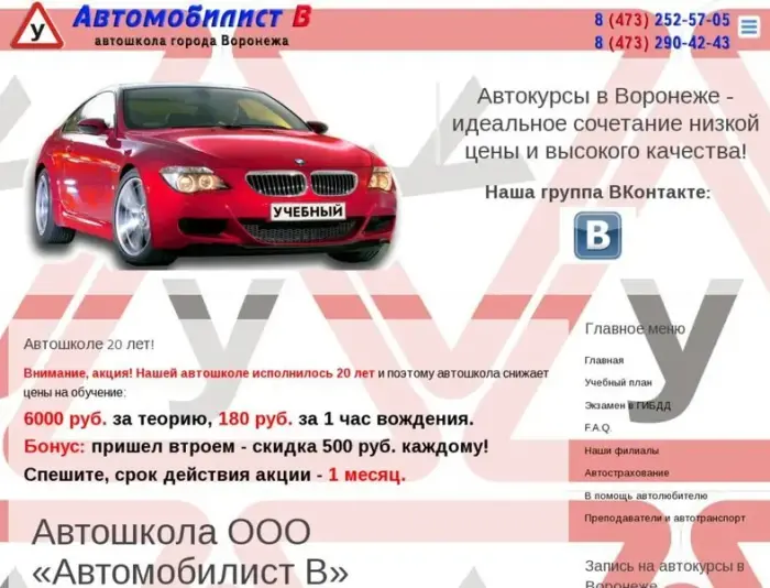 "Автошкола ООО «Автомобилист В» - это восемнадцатилетний стаж и репутация в городе Воронеж. Наши автокурсы закончили в Воронеже более 25 000 человек. В доказательство – один из самых высоких процентных показателей сдачи экзаменов в ГИБДД с первого раза. Вам нужна хорошая автошкола? Воронеж довольно богат на учебные учреждения подобного рода, но поскольку Вы зашли на наш сайт автокурсов, значит мы уже хорошо зарекомендовали себя и обязательно оправдаем самые высокие требования своих клиентов!"