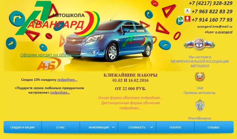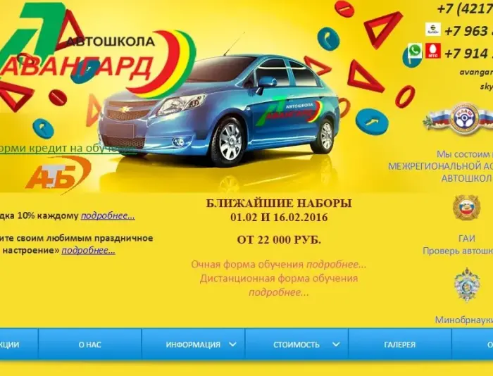 Подробную информацию об автошколе вы можете узнать по телефону или на сайте. Также вы можете связаться с нами через Skype: a.avangard или WhatsApp: +7-914-160-77-93